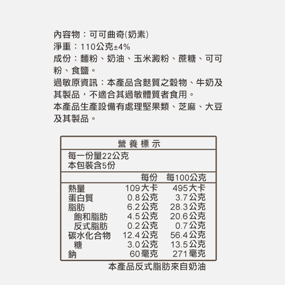可可曲奇:選用風味穩定、純粹的可可粉,香氣濃郁而不厚重,酥鬆紮實的口感中,可可微苦與甜香之間透過鹽味變得更立體、更清爽,同時放大可可的香氣。