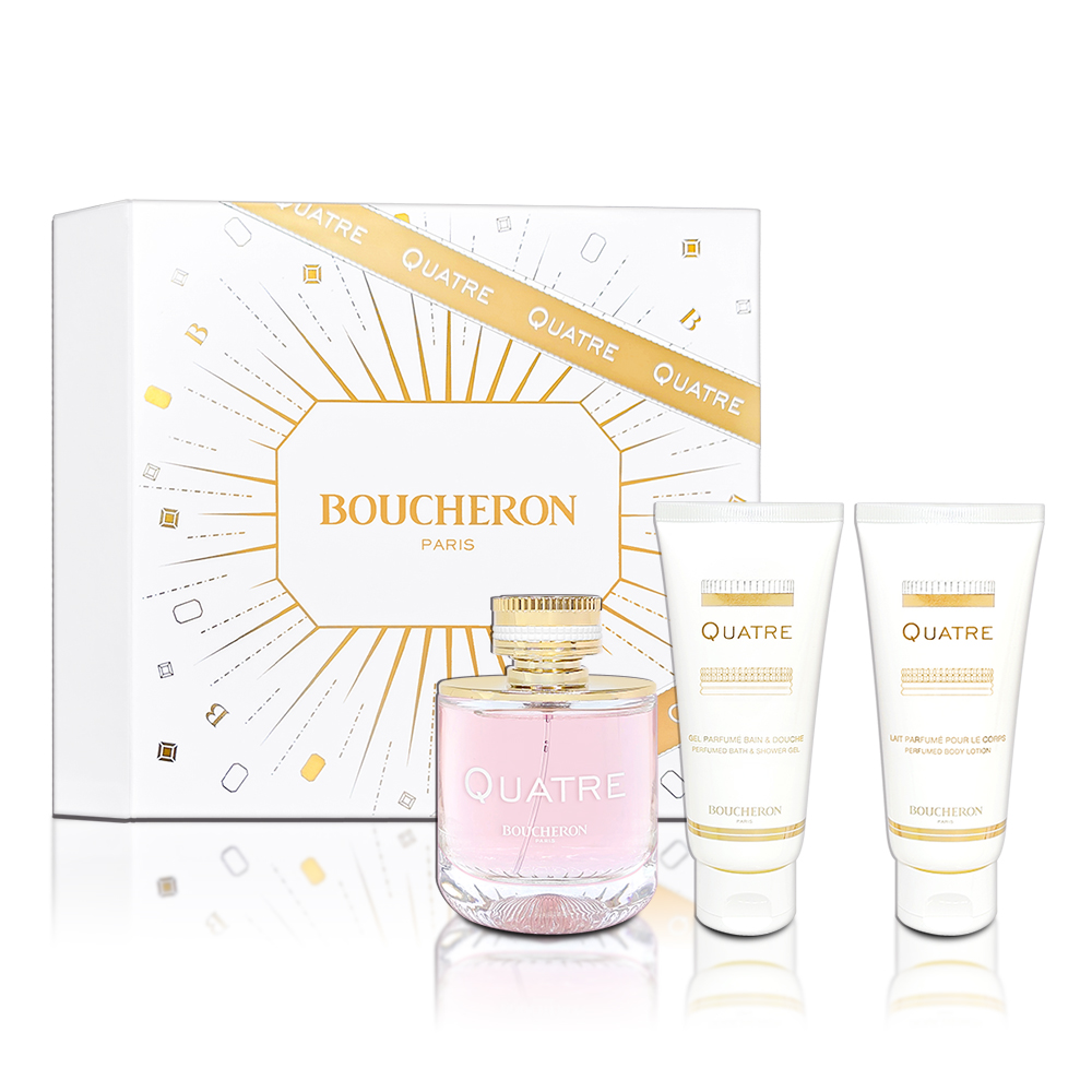 BOUCHERON 經典環戒女性淡香精禮盒(淡香精100ML+身體乳100ML+沐浴精100ML) 香 調: 柑橘花香調 、 花果甜美調前 調: 苦橙精華、巴西綠柑橘精華、紅醋栗、野草莓中 調: 茉莉花、玫瑰、Petalia後 調: 黃金木、雪松、喀什米爾、麝香