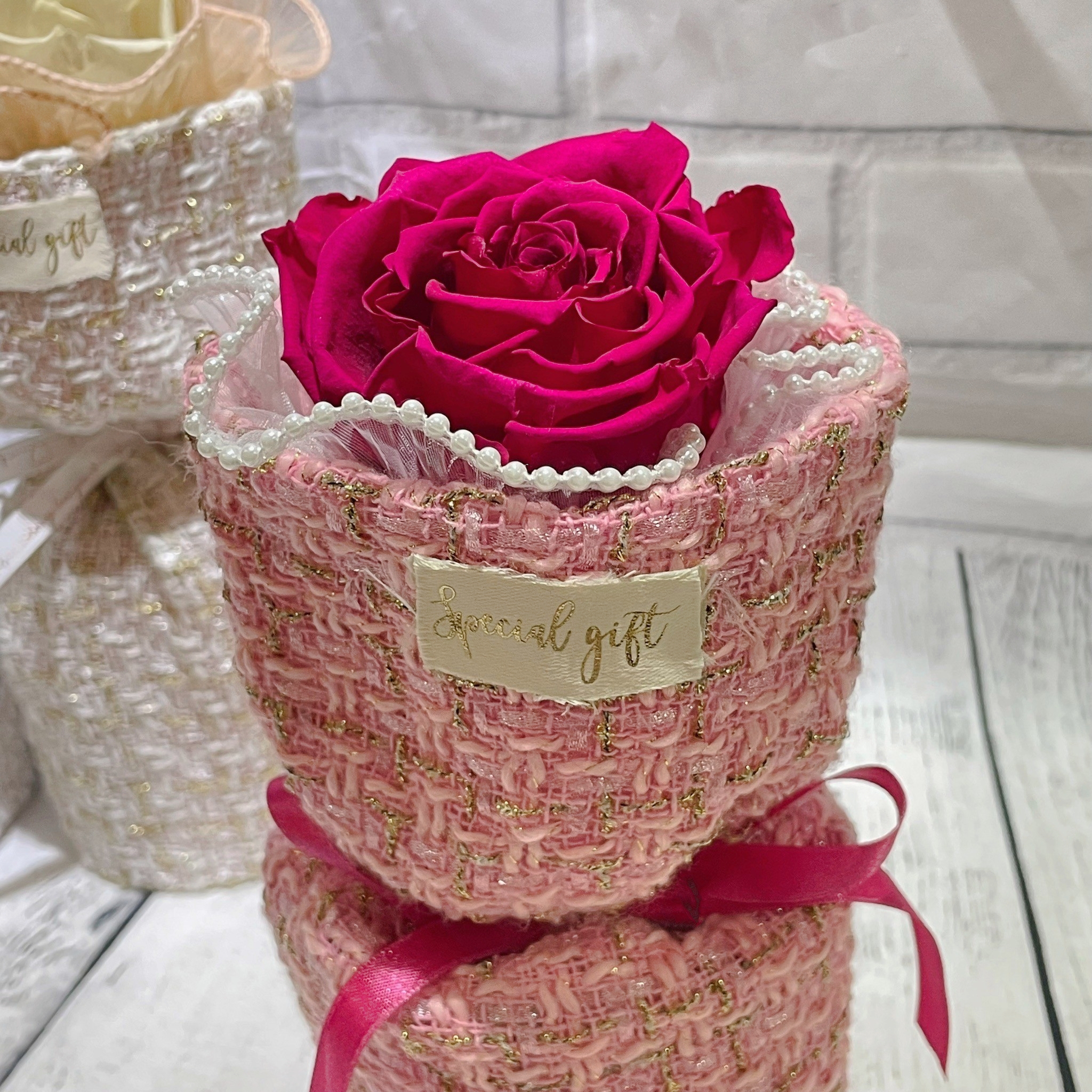 花禮說明:單朵厄瓜多Roseamor永生玫瑰花XL號+小香風包裝花禮尺寸:10×26公分