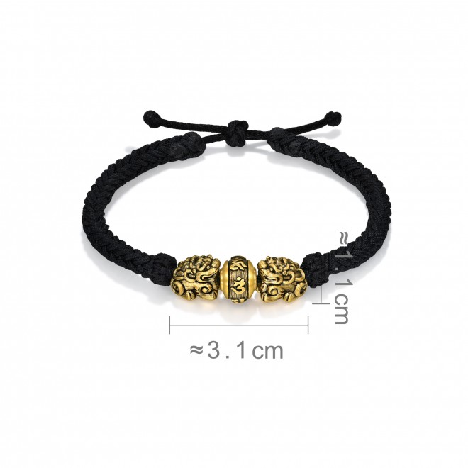 足金手鍊結合貔貅及六字大明咒經文,採用酷黑黃金工藝,造型立體分明,別具個性。串珠表面刻有六字真言「唵嘛呢叭咪吽」,左右設有一對貔貅,寓意招財進寶、護佑平安。