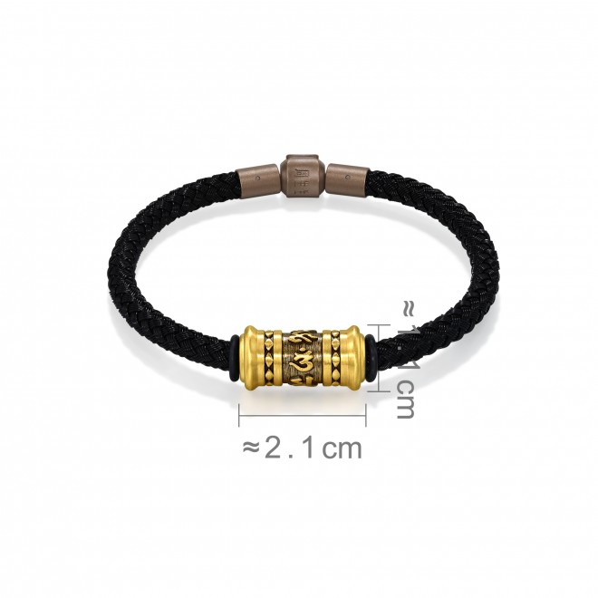 足金手鍊以佛教轉經筒為設計藍圖,結合酷黑黃金工藝,造型立體分明,別具個性。經筒表面刻有大明咒六字真言「唵嘛呢叭咪吽」,每一次轉動經筒,便猶如誦讀一遍經文,祈求平安護身、幸福圓滿。