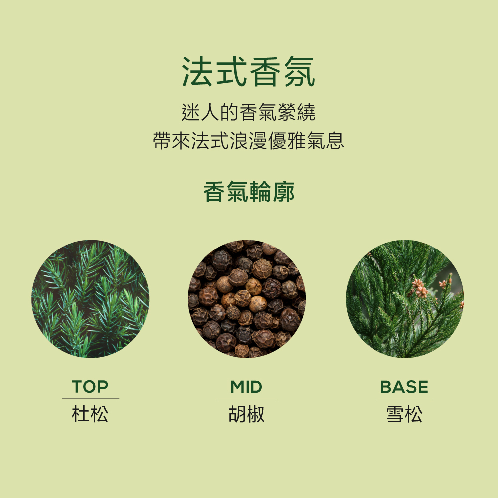 雪松的清郁調進濃郁微苦的杜松以及胡椒辛香,是一股從森林傳遞出來的沉韻香氣,讓人感受到大地的脈動,化做人們心中的永恆雋香