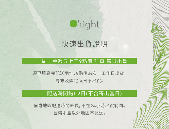 1. 完成付款並填寫收件資訊後會儘速使用本公司配合的黑貓物流寄出,出貨時間為一-三個工作天(不含例假日)。2. 僅限台灣本島、澎湖、金門、連江(馬祖)地區,暫不提供海外地區配送服務。