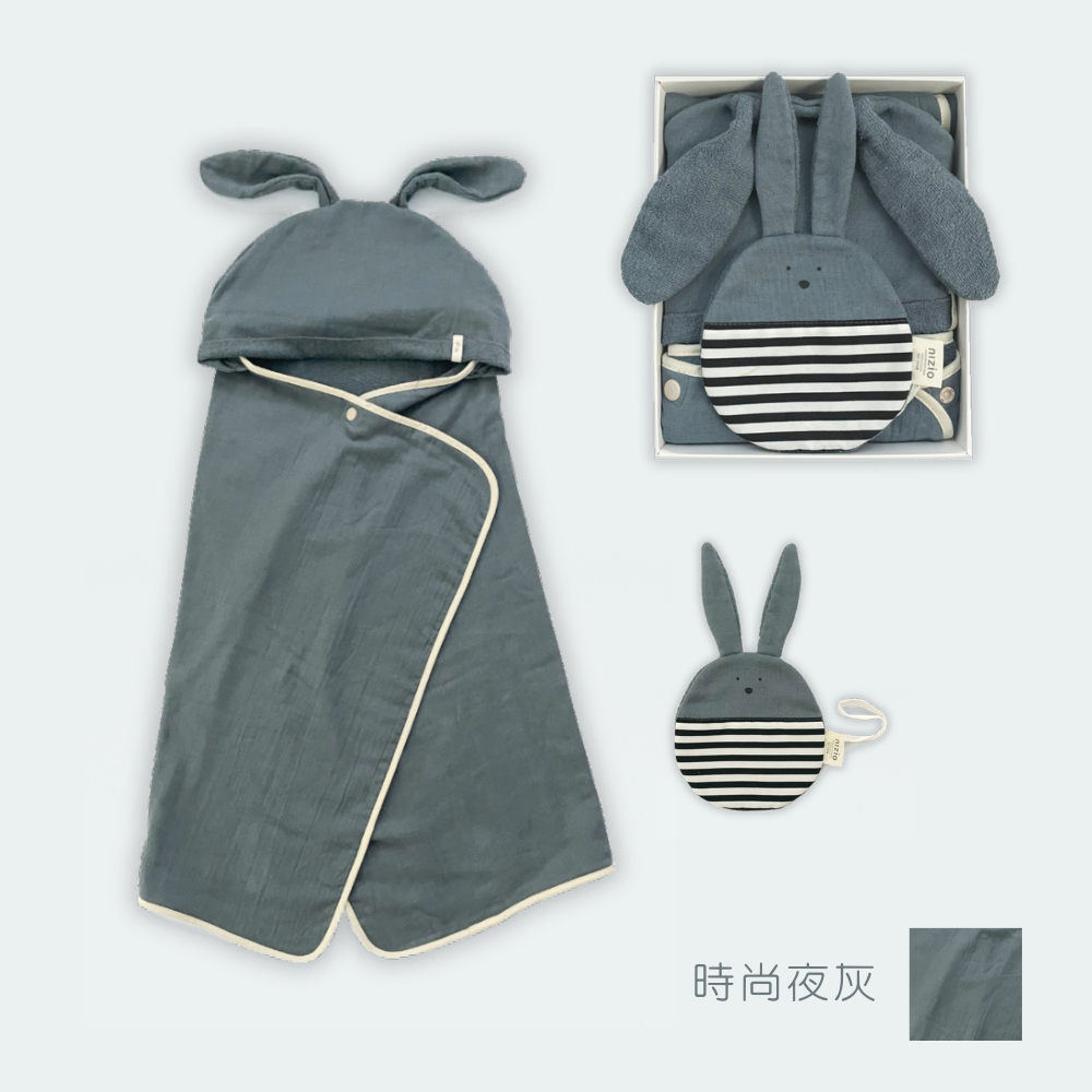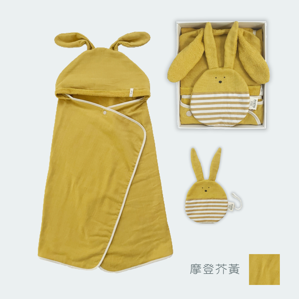 【nizio】彌月三件組-BoBo小蘑菇浴巾+兔仔帽兜斗篷浴巾 +双織雙面紗/毛巾/一大一小(附一個大禮袋+緞帶)