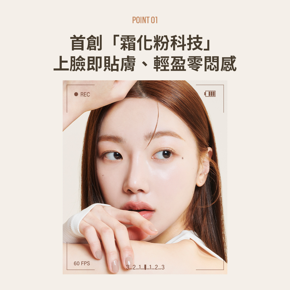 上臉透過「霜化粉科技」立刻完美貼合肌膚,清爽不黏低粉感,呈現高質感的柔霧緞面光妝效,自然不假面,打造有如天生好膚質的精緻底妝。