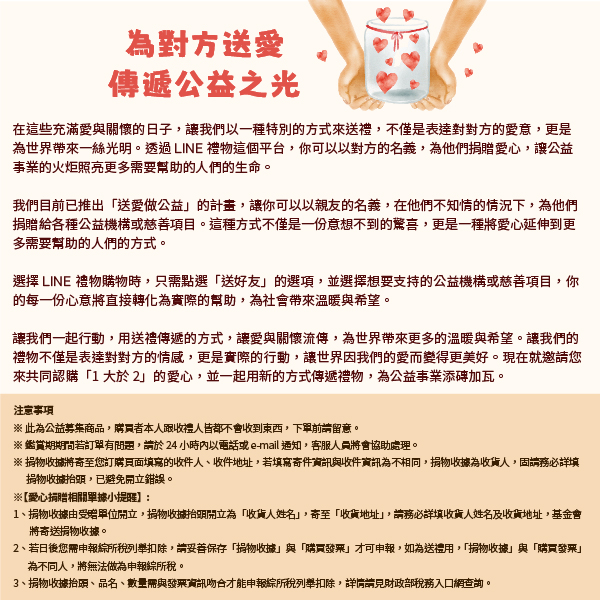 -送好友(幫對方做公益):不會收到商品,回填收件(捐物收據)地址,收禮人僅會收到「捐物收據」,送禮人僅會收到「購買發票」(無法申報綜合所得稅列舉扣除)