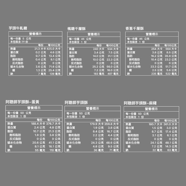 芋頭酥-麻糬成份:芋泥餡【芋頭、白鳳豆、蔗糖、麥芽糖、白油(棕櫚油)、大豆沙拉油、麥芽糊精、乳清、奶粉、黏稠劑(羥丙基磷酸二澱粉) 、椰漿粉(新鮮椰漿、麥芽糊精、乾酪素鈉)、鹽、香料】、麵粉、奶油、麻糬【甜味劑(D-山梨醇液70 %)、蔗糖、麥芽糖、羥丙基磷酸二澱粉、海藻糖、羥丙基澱粉、著色劑(二氧化鈦)、乳化劑(脂肪酸甘油酯)】、奶粉、芝麻。
