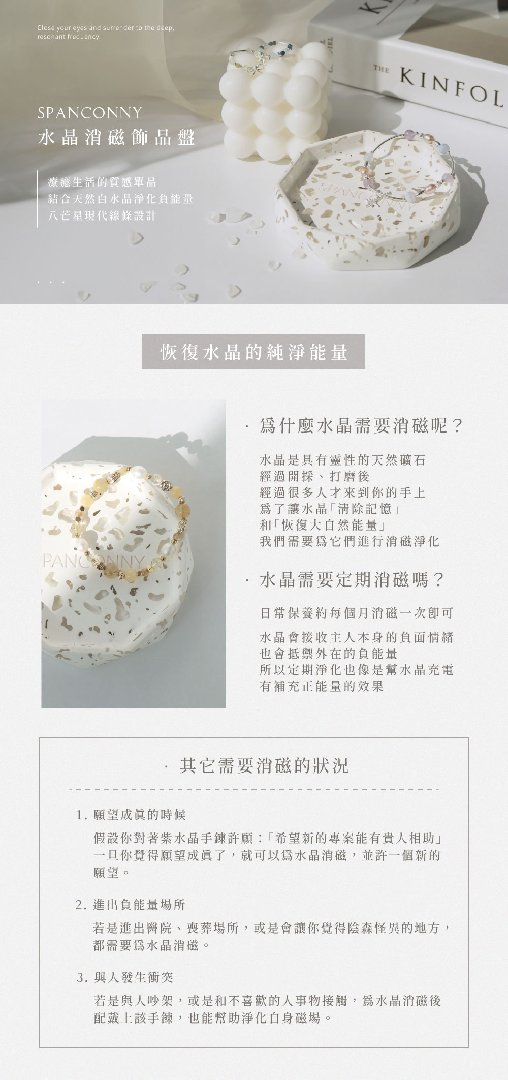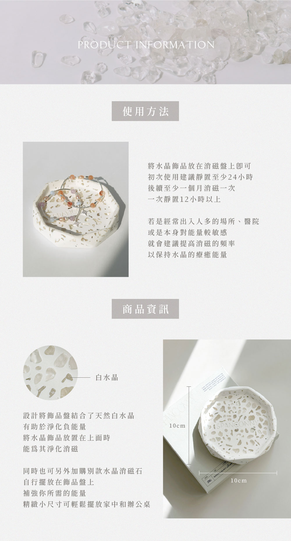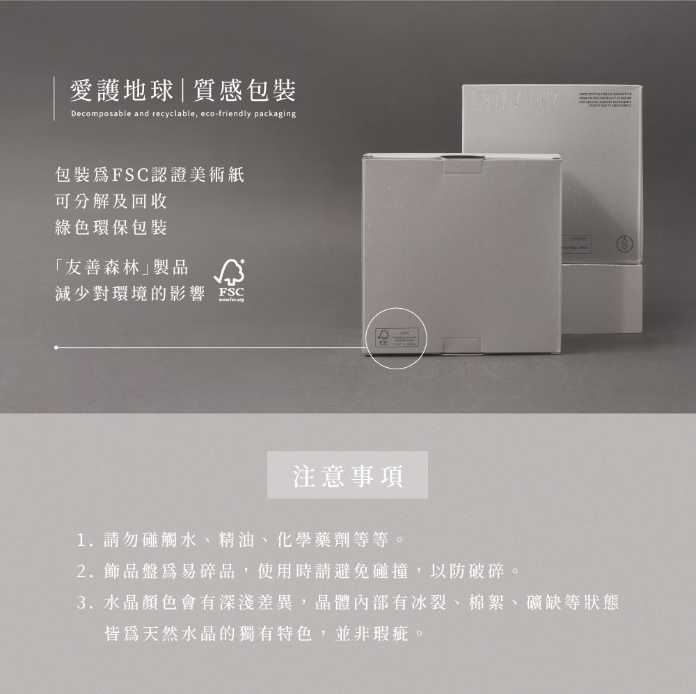 ①產品請勿碰觸水、精油、化學藥劑等等。②飾品盤為易碎品,使用時請避免碰撞,以防破碎。③採用天然水晶,晶體內部有冰裂、棉絮、礦缺等狀態,皆為天然水晶的獨有特色,並非瑕疵。④商品為天然材質,同種水晶顏色和尺寸皆會有差異,請以實際收到的商品為主。