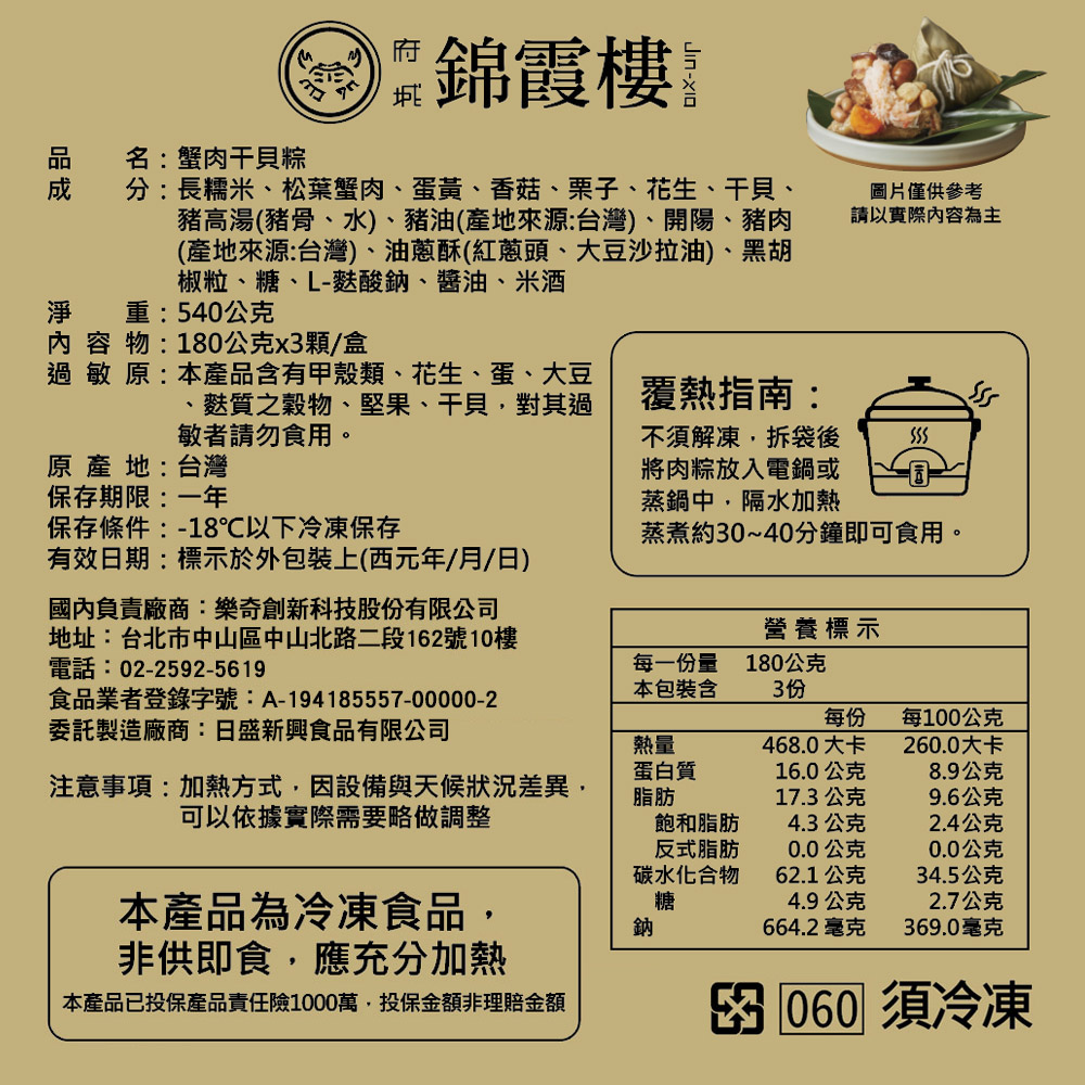 1.商品組合/規格:【錦霞樓】蟹肉干貝粽禮盒(3入) x2盒2.商品品名:【錦霞樓】蟹肉干貝粽禮盒(3入)3.內容成分:長糯米、松葉蟹肉、蛋黃、香菇、栗子、花生、干貝、豬高湯(豬骨、水)、豬油(產地來源:台灣)、開陽、豬肉(產地來源:台灣)、油蔥酥(紅蔥頭、大豆沙拉油)、黑胡椒粒、糖、L-麩酸鈉、醬油、米酒。※本產品含有甲殼類、花生、蛋、大豆、麩質之穀物、堅果、干貝,對其過敏者請勿食用。4.商品重(容)量:540g(蟹肉干貝粽180g*3顆)/盒5.原產地(國):台灣※豬原料產地:台灣6.保存期限:-18℃以下冷凍 一年(實際依商品包裝標示)7.製造廠商或國內負責廠商名稱:樂奇創新科技股份有限公司8.製造廠商或國內負責廠商地址:104027 台北市中山區中山北路二段162號10樓9.製造廠商或國內負責廠商電話:02-2592-561910.食品業者登錄字號:A-194185557-00000-211.投保產品責任險字號:明台產物保險 0803-14PDT00874號