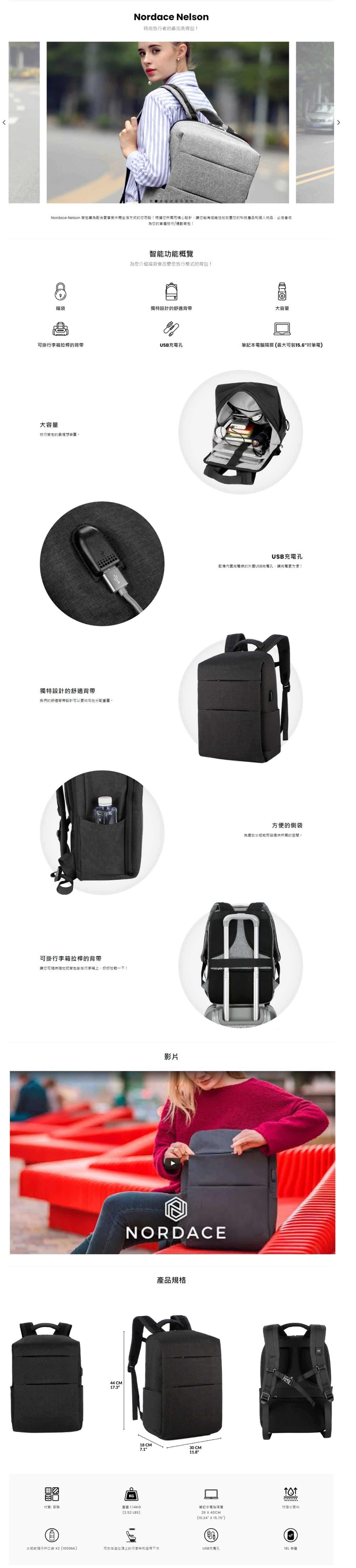 Nordace Nelson 背包專為配合更享受休閒生活方式的您而設!根據您所需而精心設計,讓您能有組織性地放置您的科技產品和個人物品,必定會成為您的首選旅行/通勤背包!