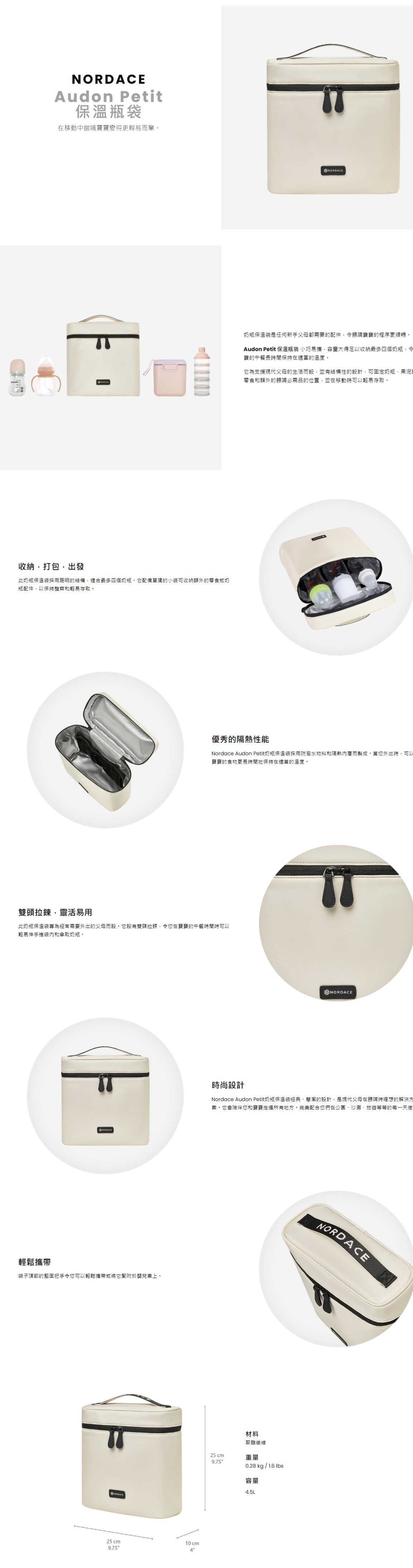 奶瓶保溫袋是任何新手父母都需要的配件,令餵哺寶寶的程序更順暢。Audon Petit 保溫瓶袋 小巧易攜,容量大得足以收納最多四個奶瓶,令寶寶的午餐長時間保持在適當的溫度。它為支援現代父母的生活而設,並有結構性的設計,可固定奶瓶、果泥罐、零食和額外的餵哺必需品的位置,並在移動時可以輕易存取。