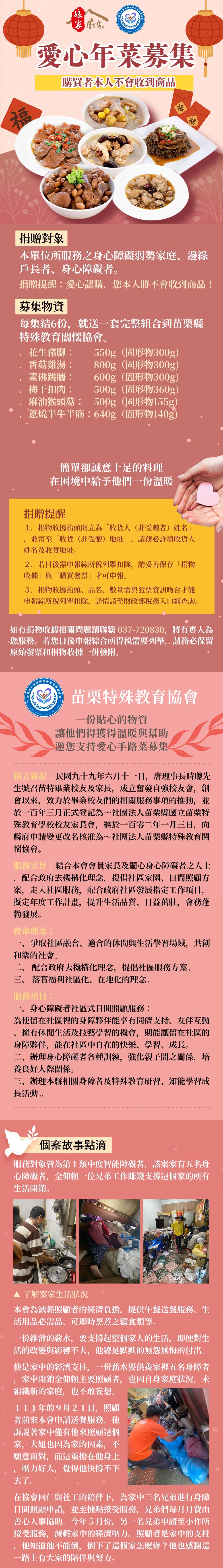 商品規格品名:【苗栗特殊教育協會X娘家廚房】愛心手路菜募集(購買者不會收到商品)規格:每集結3份,就送一套完整組合到苗栗縣特殊教育關懷協會送愛募集-私廚手路菜梅干扣肉(500g/盒)送愛募集-私廚手路菜香菇滷肉燥(240g/包)送愛募集-私廚手路菜花生豬腳(640g/盒)