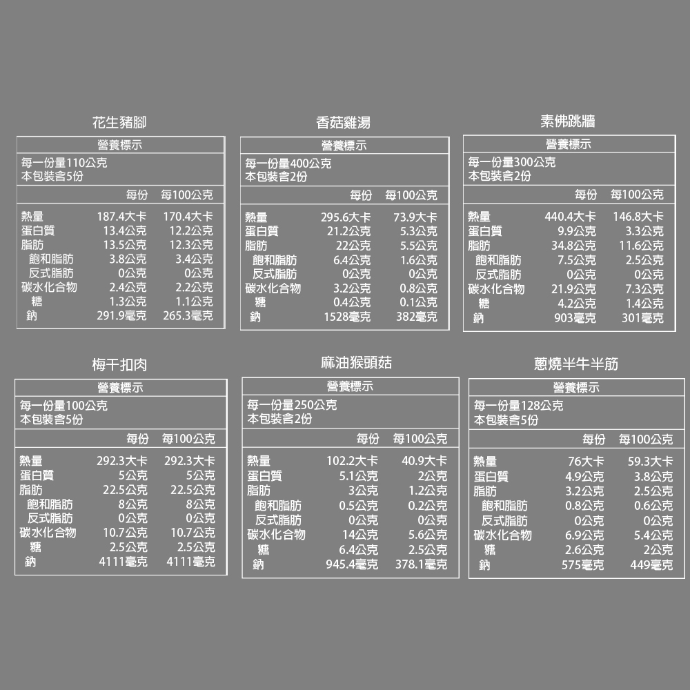 梅干扣肉:梅干菜、豬肉、水、大豆油、醬油、雞油、豬油、蒜、糖、蔥、辣椒、食鹽、味精、甘草、月桂葉、5'-次黃嘌呤核苷磷酸二鈉、5'-鳥嘌呤核苷磷酸二鈉。香菇滷肉燥:豬肉、水、醬油、味醂{果糖、水、糯米、米麴、糖、釀造酢、食鹽、胺基乙酸、檸檬酸鈉、DL-胺基丙酸、5'-次黃嘌呤核苷磷酸二鈉、5'-鳥嘌呤核苷磷酸二鈉}、紅蔥頭、糖、大豆油、乾香菇、食鹽、五香粉(八角、丁香、肉桂、小茴香、花椒)、味精、5'-次黃嘌呤核苷磷酸二鈉、5'-鳥嘌呤核苷磷酸二鈉。花生豬腳:豬腳、水、大豆油、花生、醬油、糖、豆瓣醬{黃豆(非基因改造)、米、食鹽、小麥、焦糖色素)、蕃茄醬{水、蕃茄糊、蔗糖、釀造醋、食鹽、香辛料(白胡椒、肉桂、紅辣椒、薑、丁香、肉豆蔻、芥末、月桂葉、眾香子)}、食鹽、味精、花椒粉(小紅袍、麥芽糊精)、朝天椒粉、甘草粉(甘草、麥芽糊精)、孜然粉(馬芹子)、八角、荳蔻粉(荳蔻粉、纖維素)、肉桂粉、百里香、五香粉(八角、丁香、肉桂、小茴香、花椒)、5'-次黃嘌呤核苷磷酸二鈉、5'-鳥嘌呤核苷磷酸二鈉。產地: 台灣 豬肉原產地:台灣、荷蘭、英國、瑞典、加拿大(會依生產需求等因素,不同批次之豬肉來源可能不同,請依包裝上之勾選產地為主。有效期限: 365天保存方式: 冷凍過敏原:本產品含有大豆、花生、芥末、堅果類、含麩質之穀物等,不適合其過敏體質者食用。本產品與其他含有甲殼類、芒果、牛奶、蛋、芝麻、魚類、亞硫酸鹽類或二氧化硫殘留量、軟體動物類、螺貝類、芹菜、芥末的產品於同一工廠生產,食物過敏者請留意
