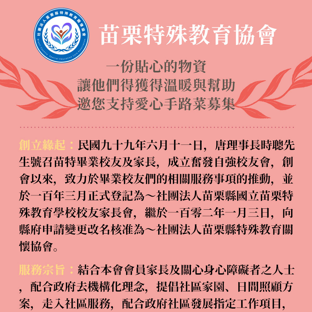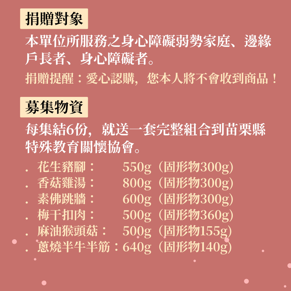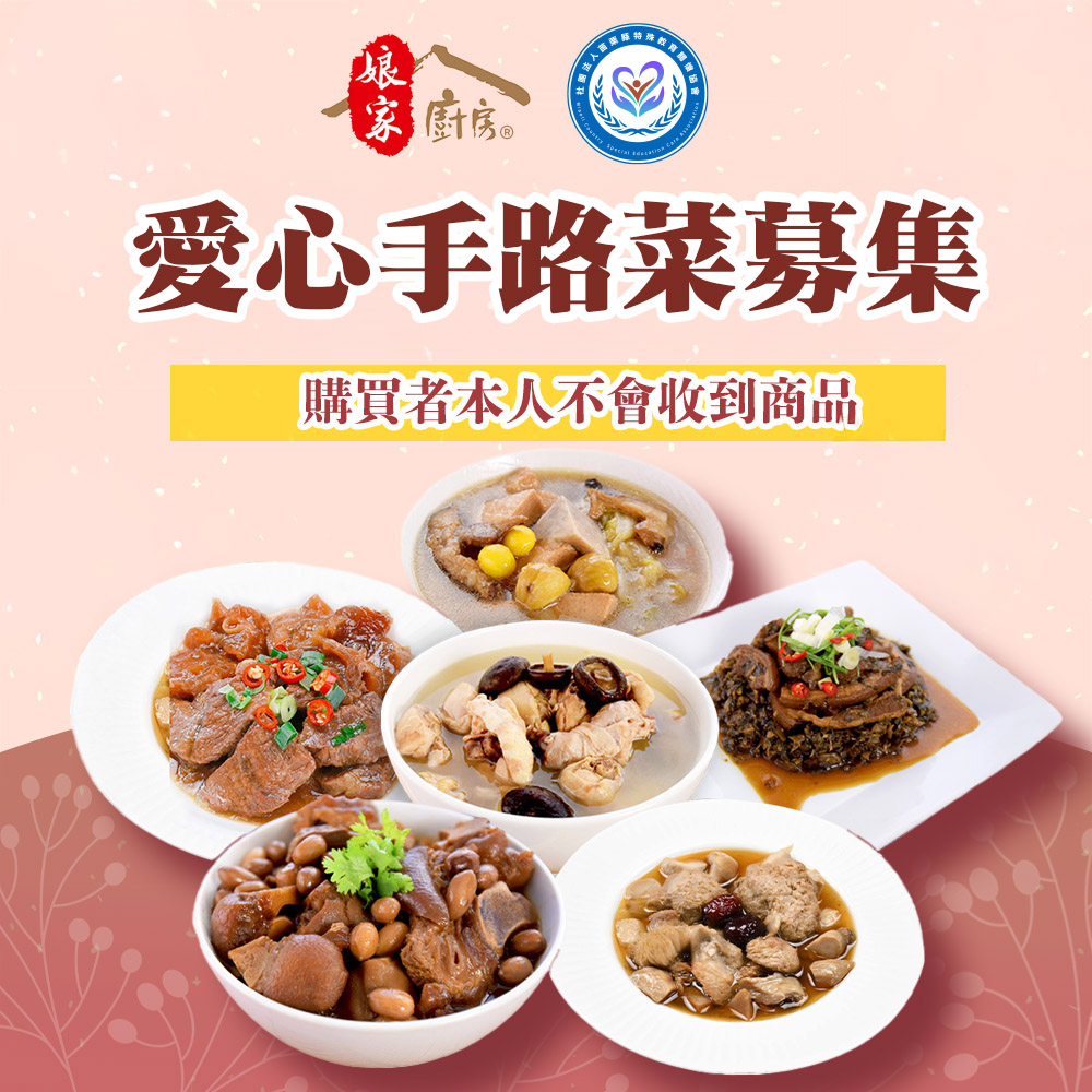 商品規格品名:【苗栗特殊教育協會X娘家廚房】愛心手路菜募集(購買者不會收到商品)規格:每集結3份,就送一套完整組合到苗栗縣特殊教育關懷協會送愛募集-私廚手路菜梅干扣肉(500g/盒)送愛募集-私廚手路菜香菇滷肉燥(240g/包)送愛募集-私廚手路菜花生豬腳(640g/盒)