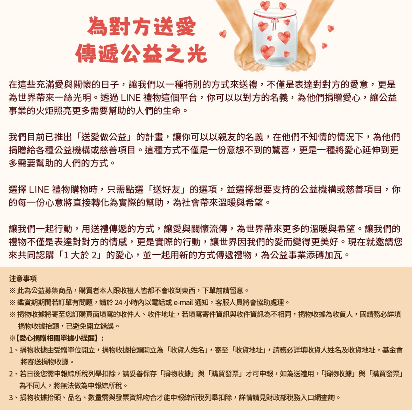 -送好友(幫對方做公益):不會收到商品,回填收件(捐物收據)地址,收禮人僅會收到「捐物收據」,送禮人僅會收到「購買發票」(無法申報綜合所得稅列舉扣除)