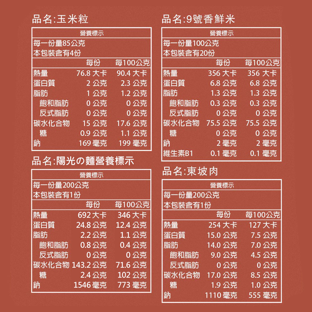 金墩米9號香鮮米:2kg/包陽光の麵:200g/包聯夏東坡肉調理包:200g/盒飯友甜玉米粒:340g/罐漁港蕃茄汁鯖魚:230g/罐,固形量150g