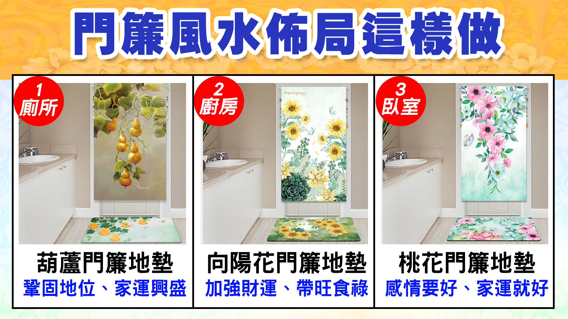 不管是在外租屋,還是首購族買房,都因為預算有限、選擇也有限,因此NG風水無所不在,門對門、門沖床,或是一開門就看到廁所、廚房灶台……等,只要學聰明掛上「風水布簾」,一招就能扭轉衰運!另外家中若不想釘牆破壞牆面,又想掛風水畫來提升磁場能量,就可以選擇色彩鮮明的油畫風水布簾來達到一樣的居家布局效果。
