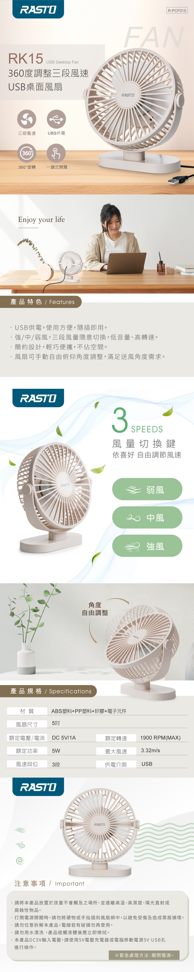 RASTO RK15 360度調整三段風速USB桌面風扇