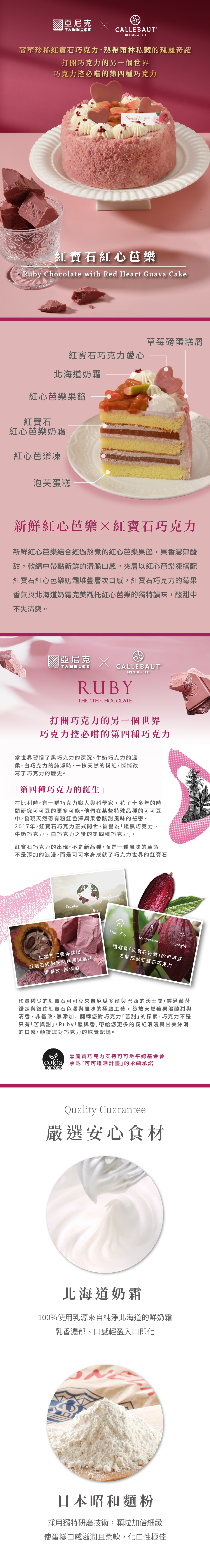 新鮮紅心芭樂結合經過熬煮的紅心芭樂果餡,果香濃郁酸甜,軟綿中帶點新鮮的清脆口感。夾層以紅心芭樂凍搭配紅寶石紅心芭樂奶霜堆疊層次口感,紅寶石巧克力的莓果香氣與北海道奶霜完美襯托紅心芭樂的獨特韻味,酸甜中不失清爽。