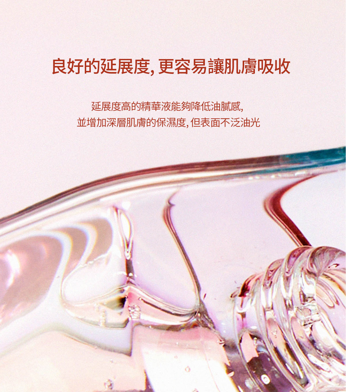 - 無黏膩感的清爽型精華液,適合油性、混合性肌膚使用