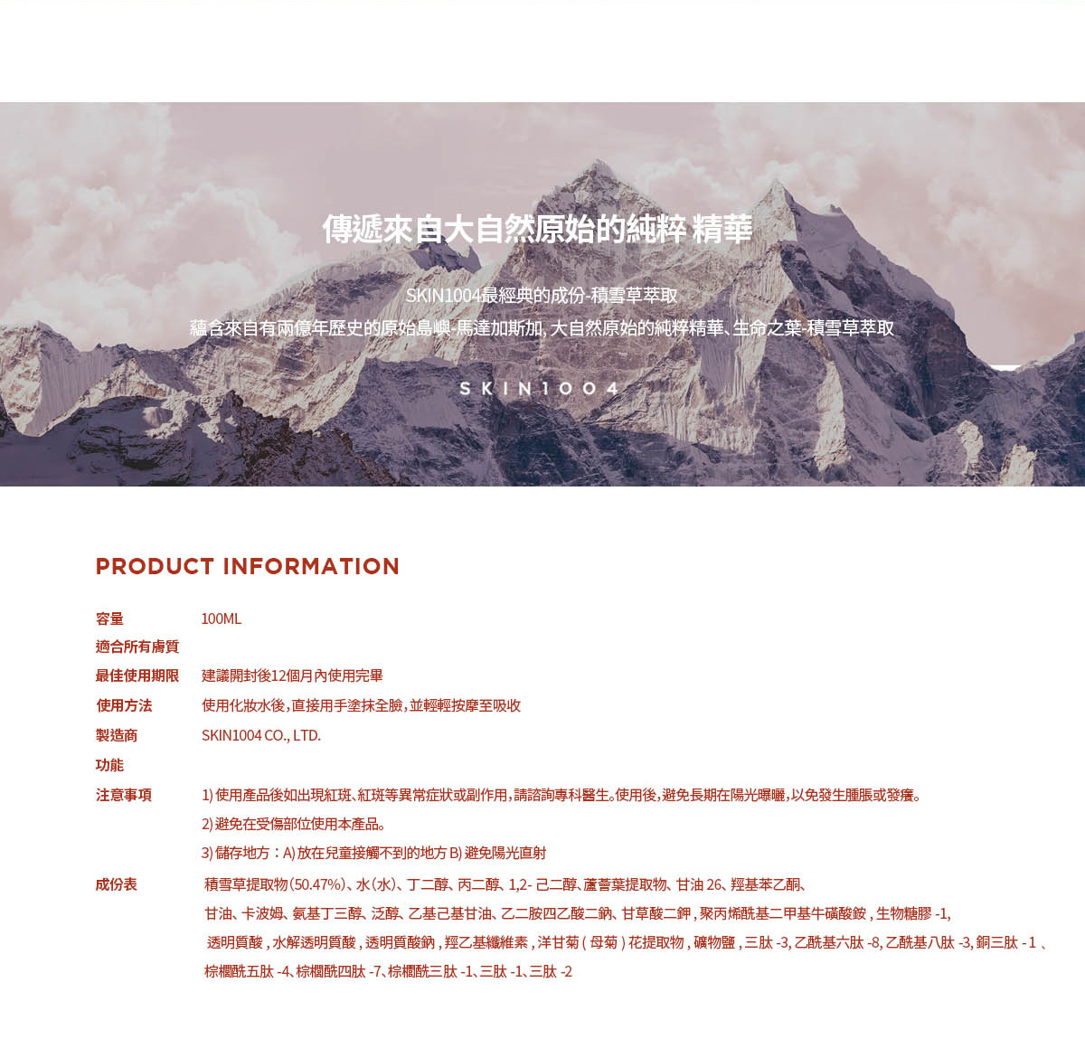 - 含有50%的SKIN1004獨有的優質馬達加斯加積雪草提取物及二聚氰胺、泛醇