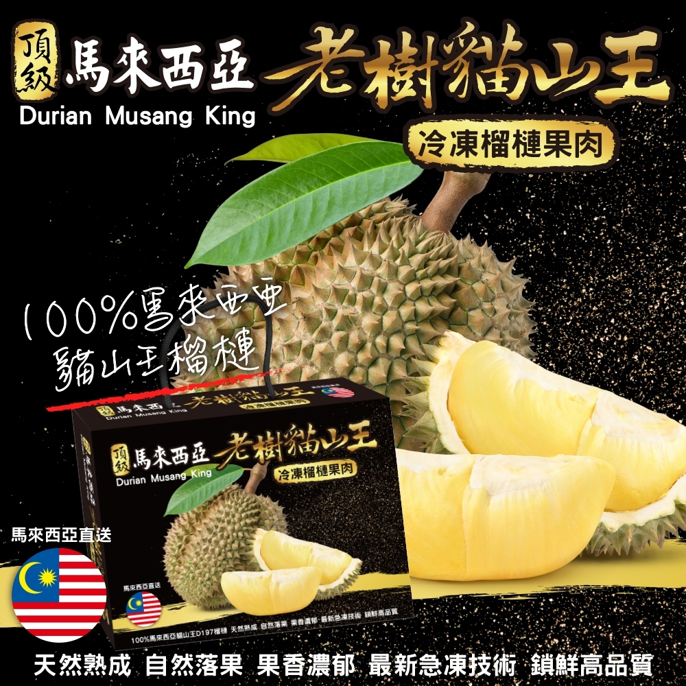 馬來西亞彭亨州文冬佔地36甲貓山王榴槤果園榮獲五年來的冠軍,優良果園的代表,使用德國進口有機肥料,從培育到販售一條龍全程把關,熟成落下四小時內急速冷凍採用真空包裝完美保存新鮮度,每一口都是新鮮風味的享受,給您帶來熱帶天堂的味蕾之旅。立即品嚐,感受頂級榴槤的奢華味