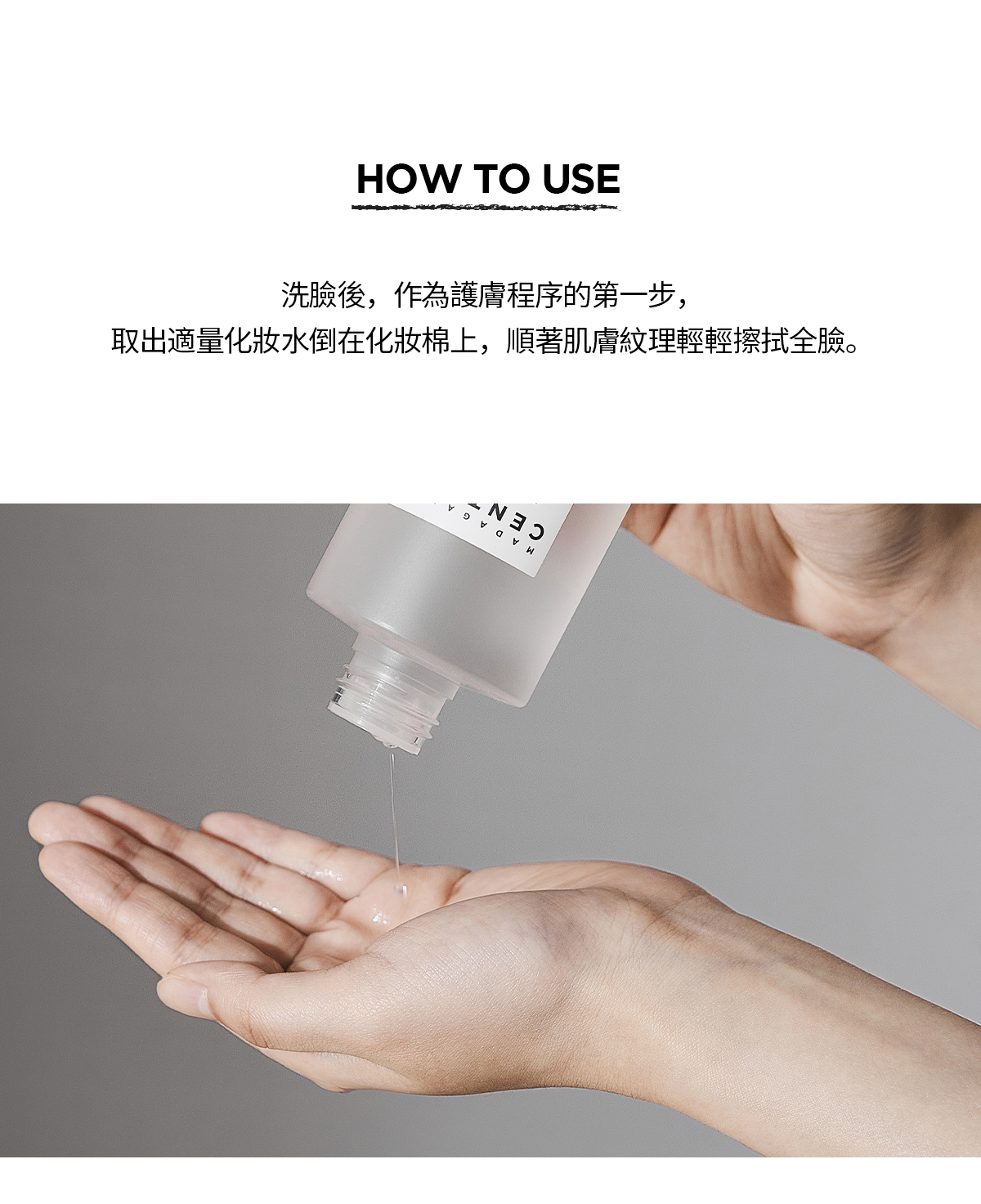 取出適量化妝水倒在化妝棉上,順著肌膚紋理輕輕擦拭全臉。