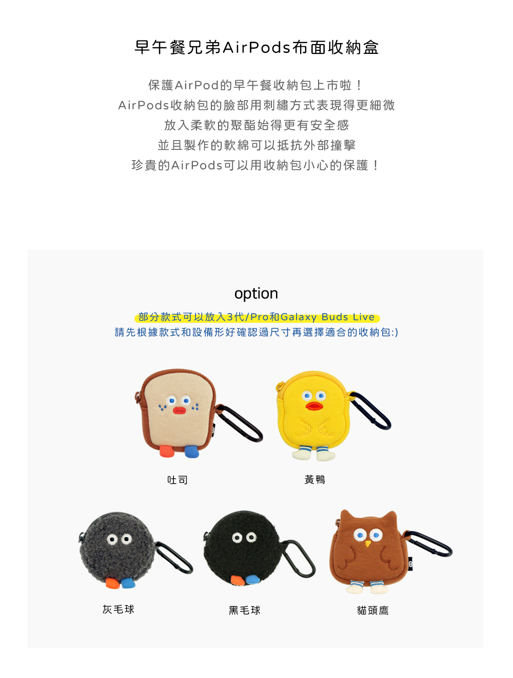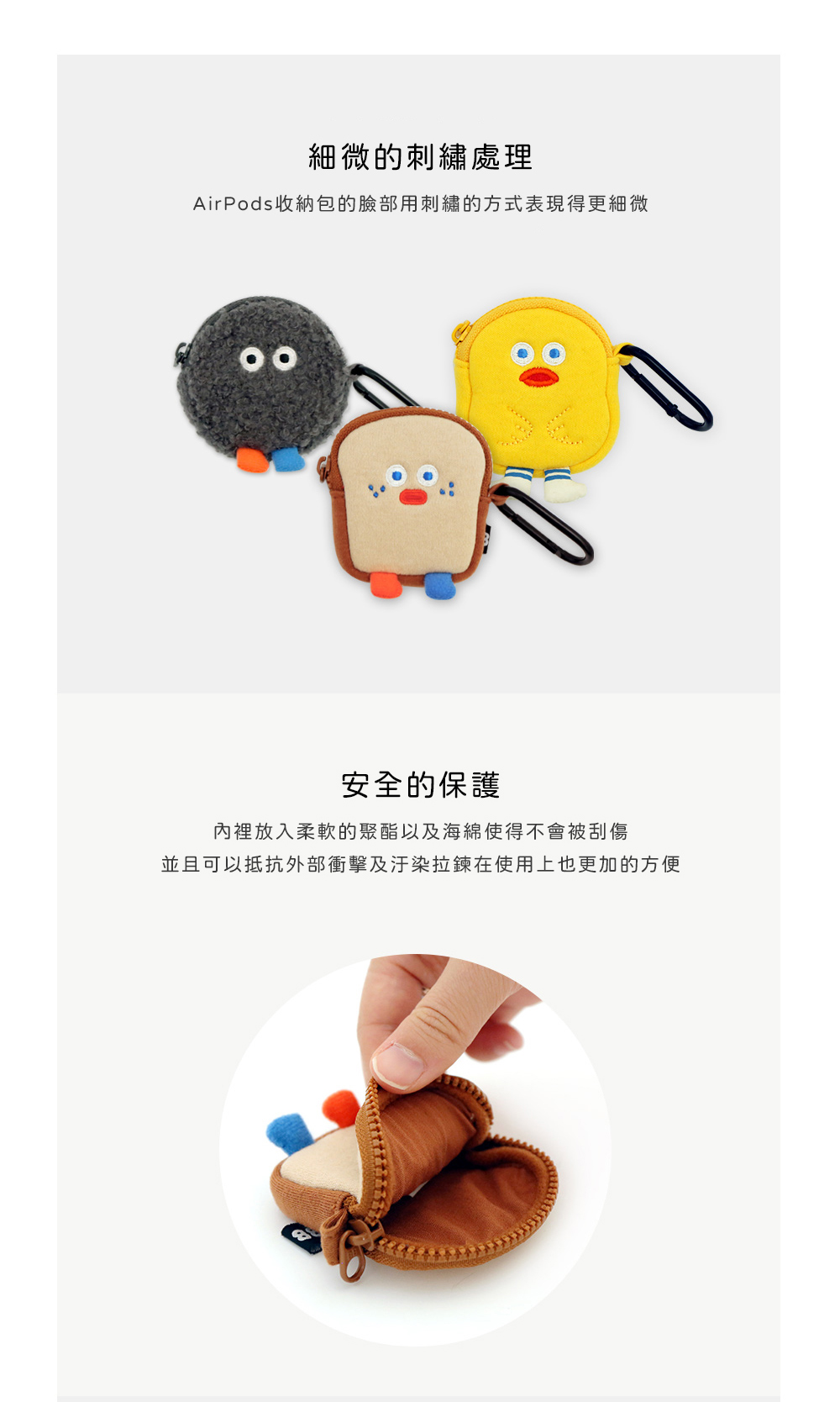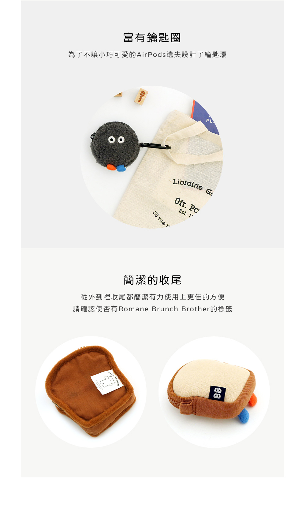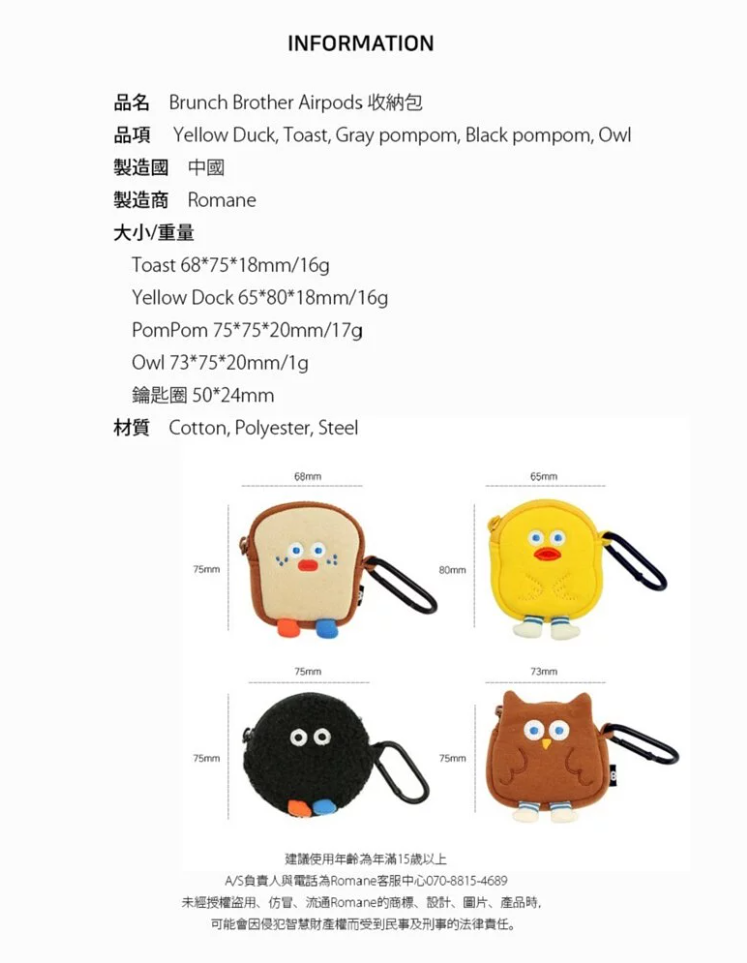 ▪️ 商品內容名稱:【Romane Brunch brother】早午餐兄弟 Airpods 1/2代 耳機保護套 耳機收納包貨號:吐司8809694710170 / 黃鴨8809694710163 / 貓頭鷹8809694710545 / POMPOM灰8809694710521 / POMPOM黑8809694710538材質:棉/聚酯纖維/鋼功能:收納耳機尺寸:吐司6.8x7.5cm、黃鴨6.5x8cm、貓頭鷹7.3x7.5cm、PomPom7.5x7.5cm