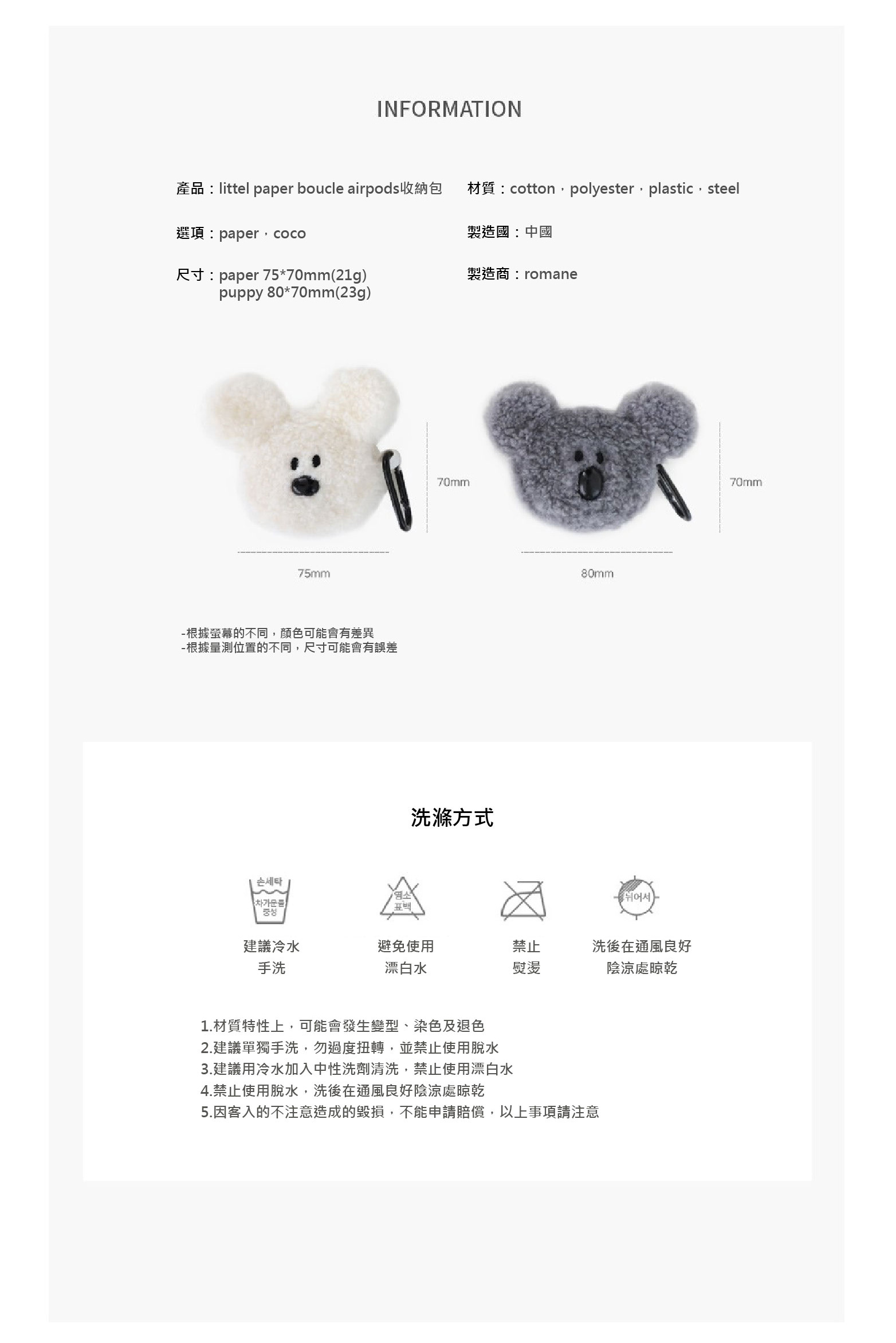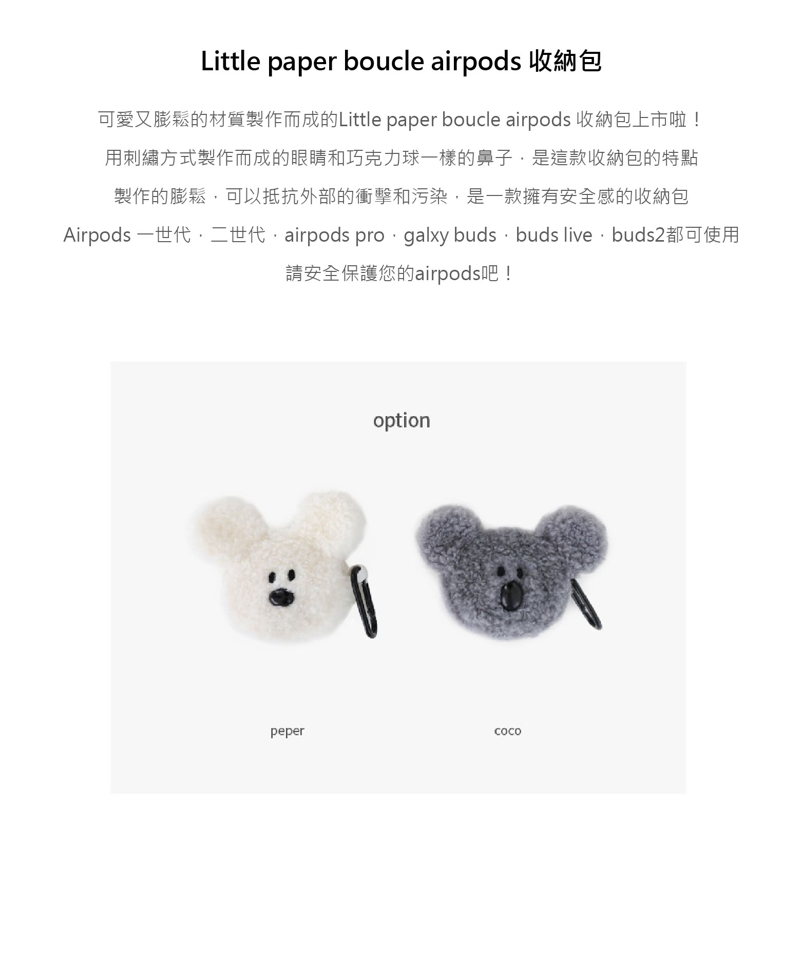 ▪️ 商品內容名稱:【Romane Brunch brother】早午餐兄弟 Airpods 1/2代 無尾熊CoCo/狗狗Peper 耳機保護套 耳機收納包貨號:coco灰8809820461419 / peper白8809820461426材質:棉/聚酯纖維/鋼功能:收納耳機尺寸:coco無尾熊7 x 7.5cm、peper小狗8 x 7cm