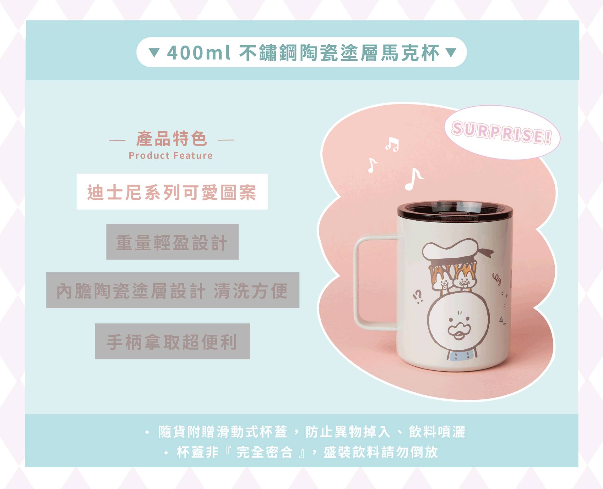 【內容物】• 迪士尼夢想派對系列-400ML不鏽鋼陶瓷塗層馬克杯-米奇限定款