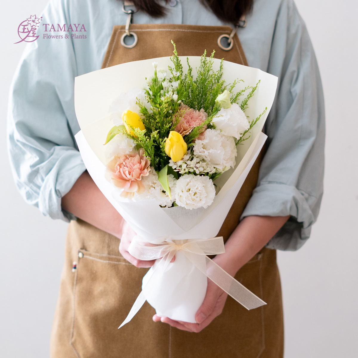 使用花材:黃鬱金香、白洋桔梗、奶茶康乃馨、深山櫻、麒麟草。