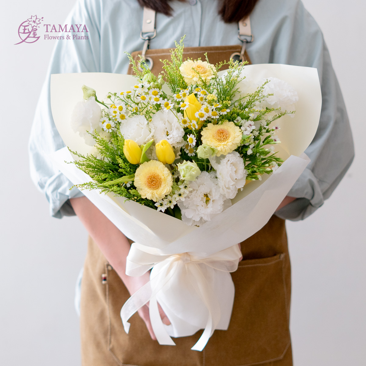 使用花材:黃迷你太陽、黃鬱金香、白洋桔梗、洋甘菊、伯利恆之星、深山櫻、麒麟草。