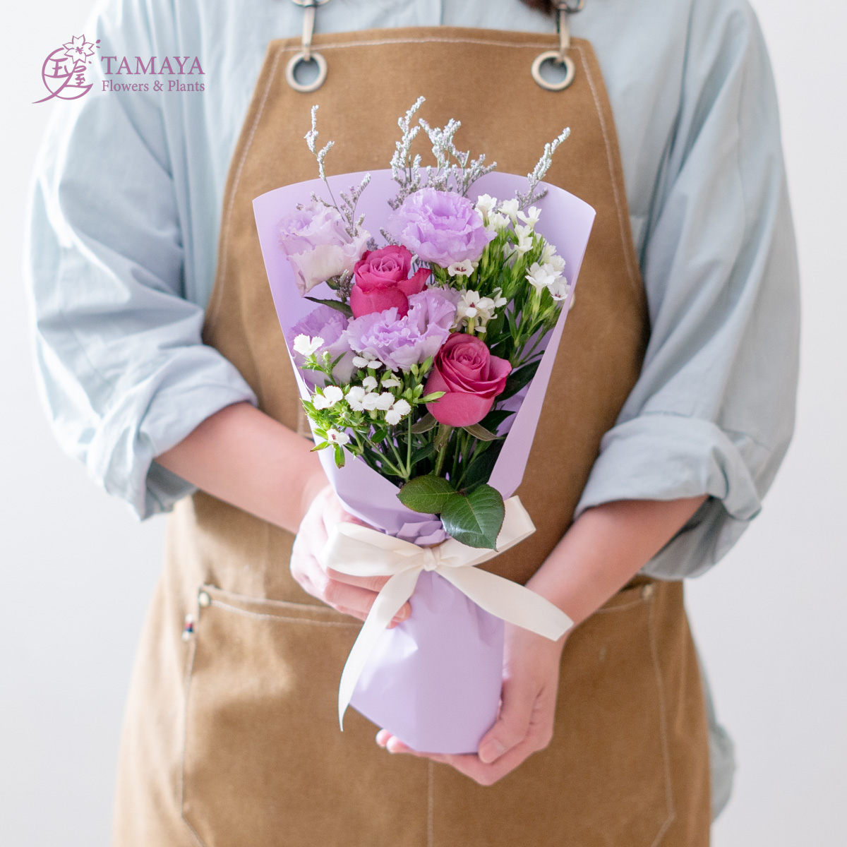 使用花材:紫玫瑰、紫洋桔梗、深山櫻、卡斯比亞。