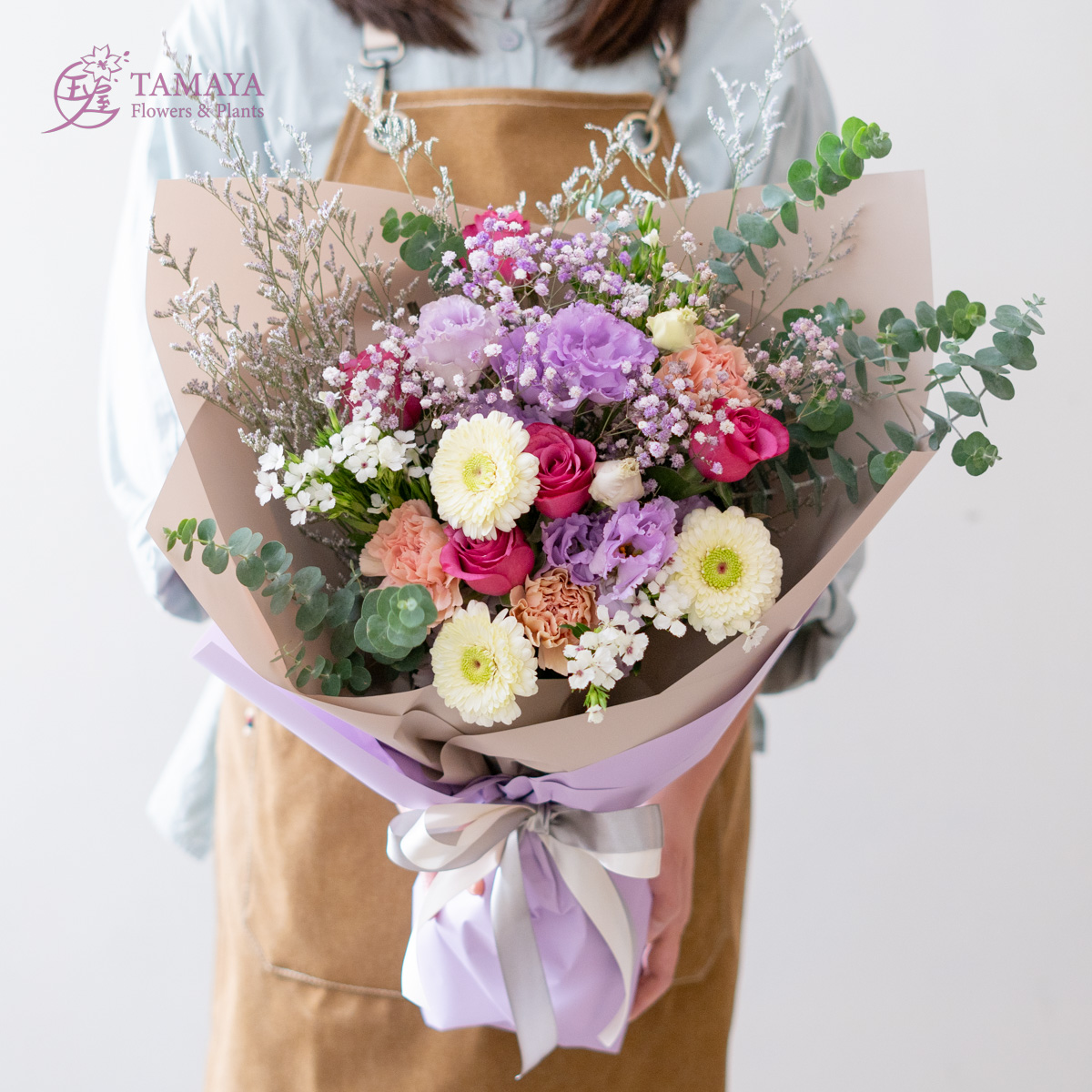 使用花材:紫玫瑰、白迷你太陽、紫洋桔梗、奶茶康乃馨、深山櫻、紫滿天星、尤加利葉、卡斯比亞。