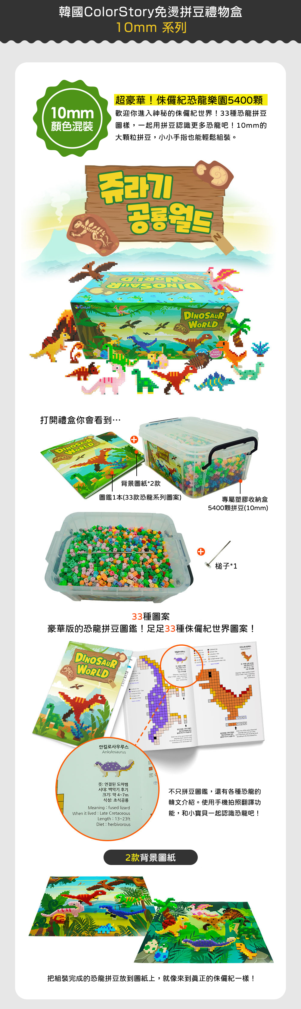 附配件: 扣環*3 槌子*1 背景圖紙*2 恐龍拼豆圖鑑*1 (33種恐龍圖案)