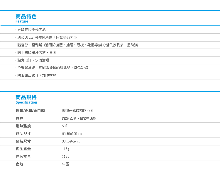 30×500 cm 可依照所需,任意裁剪大小隨意剪,輕鬆鋪 (適用於櫥櫃、抽屜、層板、鞋櫃等)防止櫥櫃髒汙沾黏、受潮避免油汙、水漬滲透放置餐具時,可減緩餐具的碰撞聲,避免刮傷防滑凹凸紋理,加厚材質