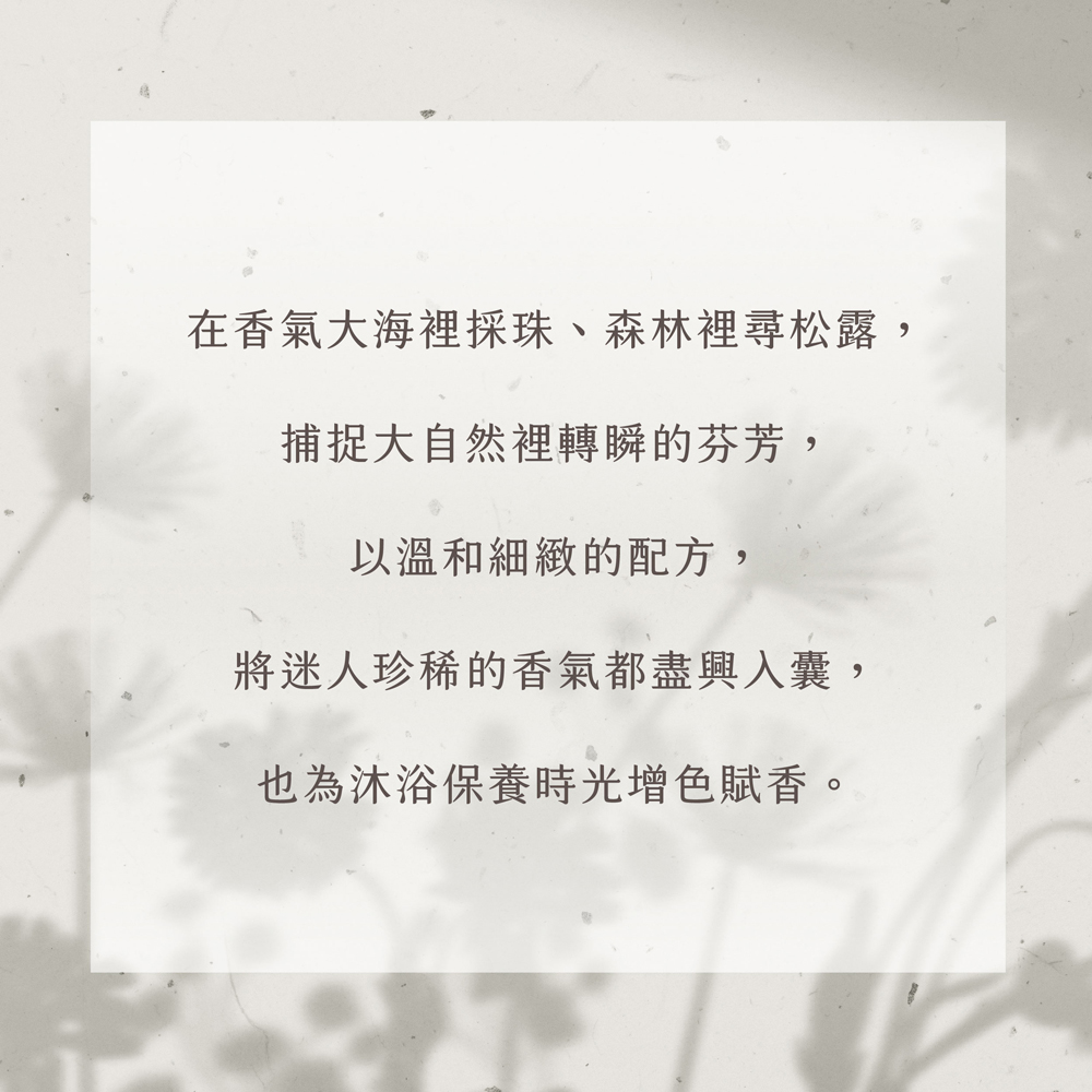 在香氣大海裡採珠、森林裡尋松露,捕捉大自然裡轉瞬的芬芳,以極簡溫和的配方,將迷人珍稀的香氣都盡興入囊。