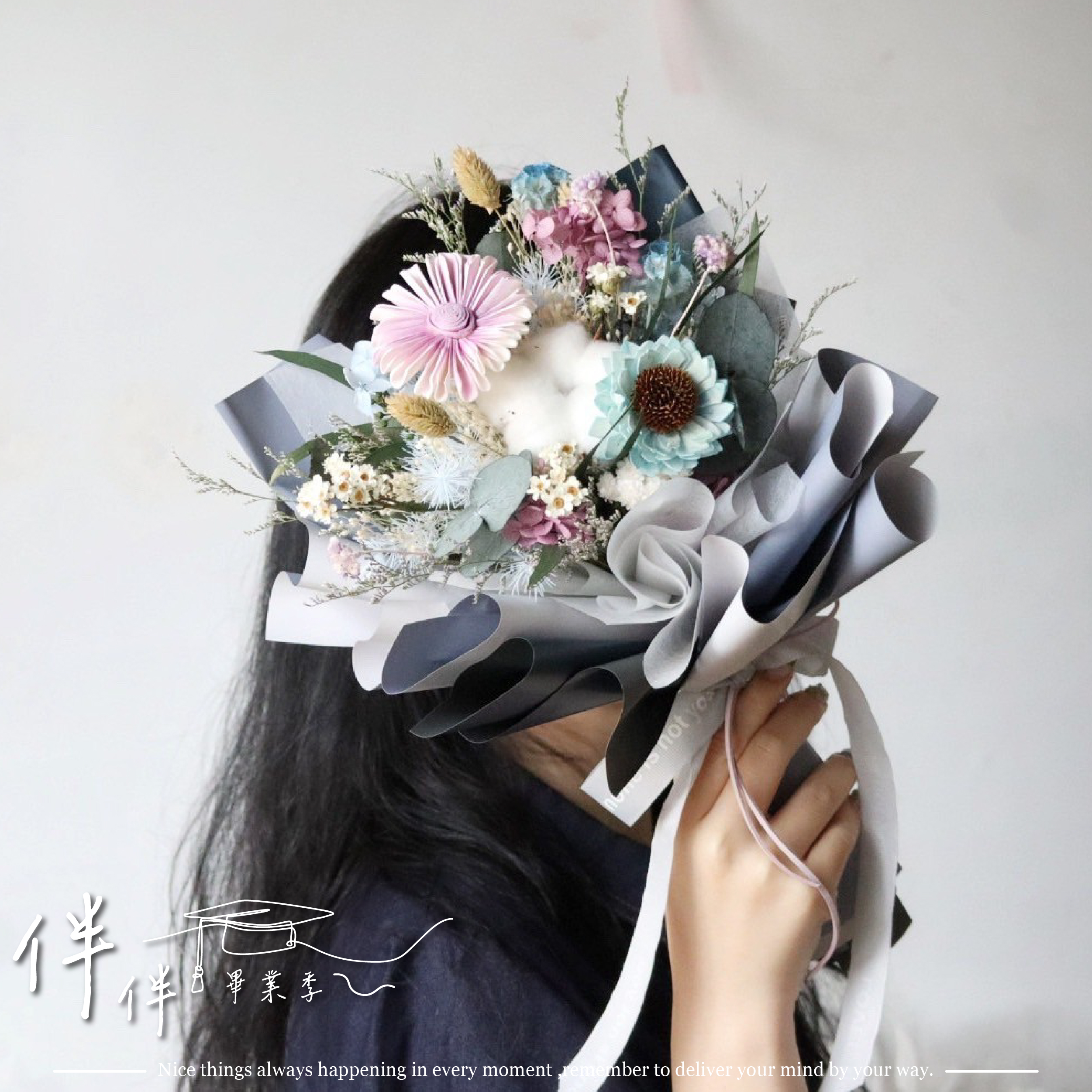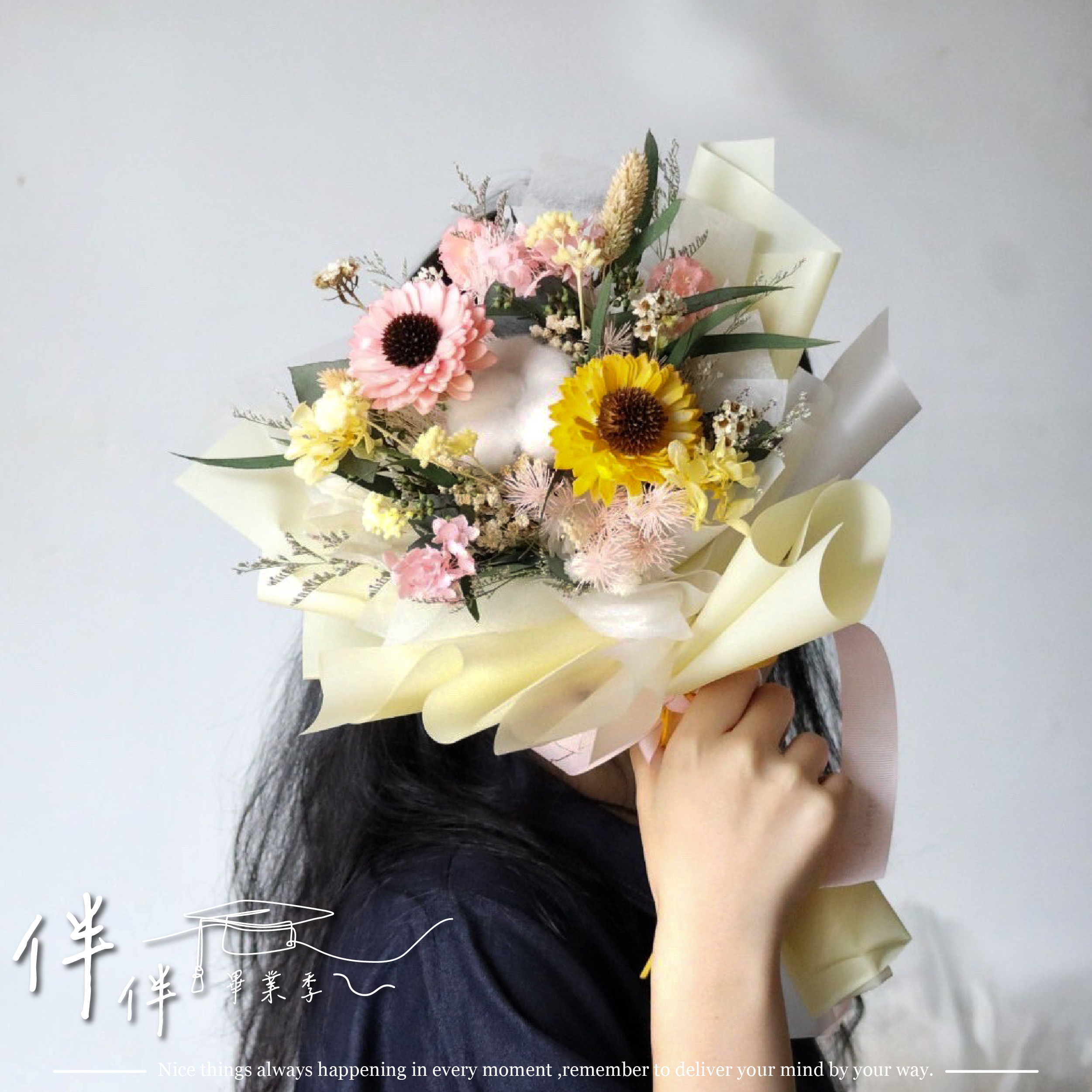 擴香向日葵、棉花、永生繡球、法國白梅、不凋松蟲果、義大利尤加利葉、永生兔尾草....等