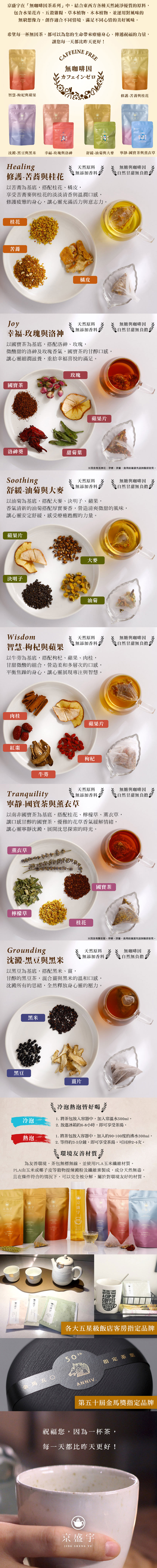 組合/規格:10入茶包/袋商品品名:油菊大麥茶商品重(容)量:3g x10入內容物成分:大麥(澳洲、美國)、蘋果片(德國)、決明子(印度)、油菊(台灣)食品添加物名稱:無生產地(國):台灣/組合/規格:10入茶包/袋商品品名:枸杞蘋果茶商品重(容)量:4g x10入內容物成分:枸杞(中國)、牛蒡(台灣)、紅棗(台灣)、蘋果(德國)、肉桂(越南)食品添加物名稱:無生產地(國):台灣/組合/規格:10入茶包/袋商品品名:薰衣草國寶茶商品重(容)量:4g x10入內容物成分:南非國寶茶(南非)、桂花(中國)、檸檬草(泰國)、薰衣草(法國)食品添加物名稱:無生產地(國):台灣/組合/規格:10入茶包/袋商品品名:玫瑰洛神國寶茶商品重(容)量:4g x10入內容物成分:南非國寶茶(南非)、蘋果(德國)、玫瑰(伊朗)、洛神葵(越南)、甜菊葉(台灣)食品添加物名稱:無生產地(國):台灣/組合/規格:10入茶包/袋商品品名:苦蕎桂花茶商品重(容)量:5g x10入內容物成分:苦蕎(韃靼蕎麥)(台灣)、桂花(中國)、橘皮(台灣)食品添加物名稱:無生產地(國):台灣/組合/規格:10入茶包/袋商品品名:黑米黑豆茶商品重(容)量:7.5g x10入內容物成分:黑豆(台灣)、黑米(台灣)、薑(台灣)食品添加物名稱:無生產地(國):台灣/廠商名稱:京盛宇現代食茶股份有限公司廠商地址:台北市內湖區內湖路一段91巷17號2樓之4廠商電話:(02)87120017保存期限:2年以消費者收受日算起,至少距離有效日期前:365日食品業者登錄字號:A-129067606-00000-4投保產品責任險字號:新安產險/17225字第11ML000168號