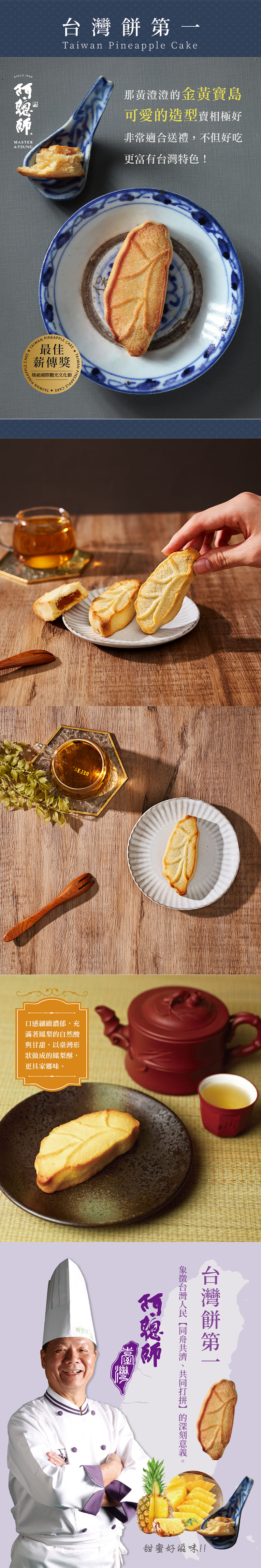 ⭐媽祖國際觀光文化節-最佳薪傳獎!⭐皮薄餡多、鬆軟不黏牙、口感細緻濃郁⭐充滿著鳳梨的自然酸與甘甜⭐以台灣形狀做成的鳳梨酥更具家鄉味⭐以台灣獨特餅型象徵台灣人民【同舟共濟、共同打拼】的深刻意義