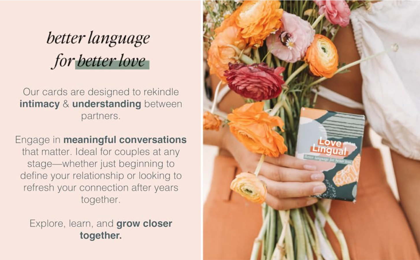 這款 Love Language(愛的語言)卡牌組均可增進您和重要伴侶間的親密關係。 怎麼做到的? 透過詢問正確的問題。 什麼時候開始和對方談心都不會太早或太晚!