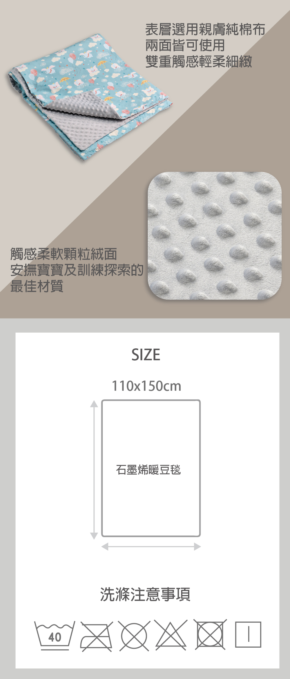 【商品資訊】【產 地】台灣【年 齡】0歲以上【材 質】表:100%棉、中層:100%聚酯纖維(含石墨烯纖維) /背面:100%聚酯纖維【尺 寸】110x150 cm