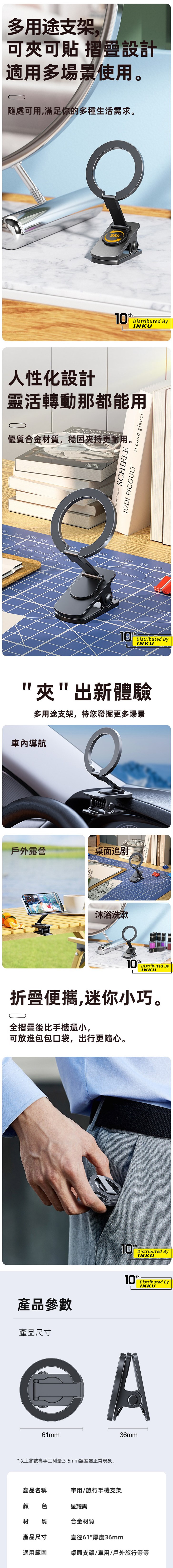 產品資訊產品名稱:D53-1 車用/旅行手機支架產品顏色:黑色【可黏可夾 送1魔鬼氈 2引磁環】產品材質:合金材質產品尺寸:直徑61*厚度36mm產品淨重:120g適用範圍:桌面支架/車用/戶外旅行等等