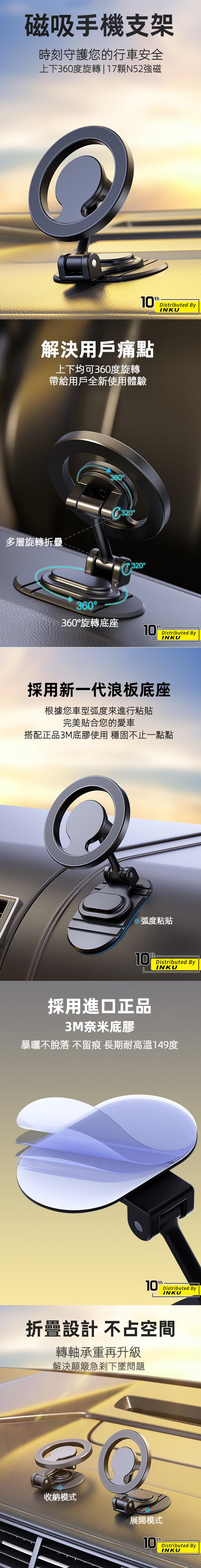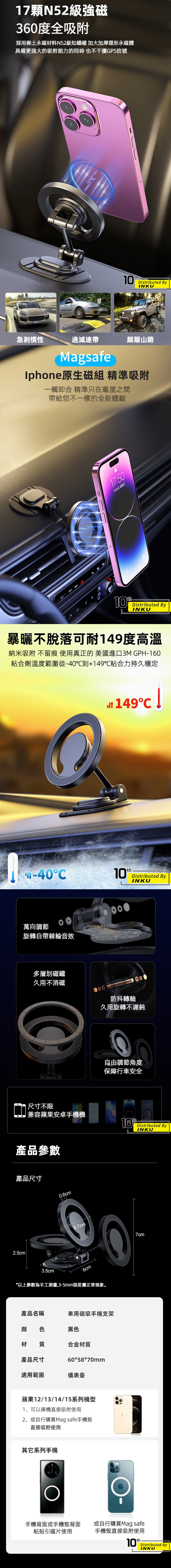 功能特點:1.獨家專利設計,IPHONE原生磁鐵組,穩固吸附,蘋果/安卓機型全相容2.底座新一代浪板底座 平面/弧面都可以黏貼,穩固不脫落3.底部採用進口正品3m膠,長期奈高溫149度,黏性較穩固,不留痕4.內置17顆N52強磁鐵,永磁材料,加大加厚環形永磁體,不干擾手機訊號5.升級底座和頭部皆可360度旋轉,亦可折疊伸縮,自由調整角度