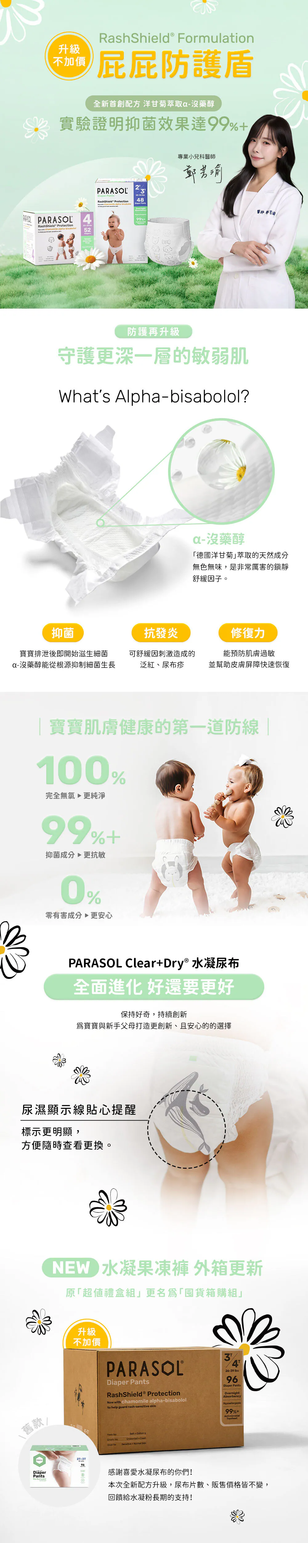 ▶2026進化版|升級不加價◀首創!屁屁防護盾配方RashShield®添加洋甘菊萃取α-沒藥醇,抑菌效果達99%+來自加州的新科技時髦尿布,世界級認證安心材質專為敏感肌膚設計,Throw away你的屁屁膏!台灣媽媽瘋稱奇蹟「水凝尿布」,透氣無異味什麼是α-沒藥醇(Alpha-bisabolol)?.抑菌:99%+抑制細菌生長,從根源預防尿布疹.抗發炎:舒緩因刺激造成的泛紅屁屁.修復力:預防肌膚過敏,幫助皮膚屏障快速恢復⭐進化版版型設計不變⭐版本交替期間,新舊並行出貨,敬請安心使用⭐版型偏小,寶寶身型不同,尺寸僅供參考⭐箱裝尿布因個人衛生考量,開箱即無法退換貨