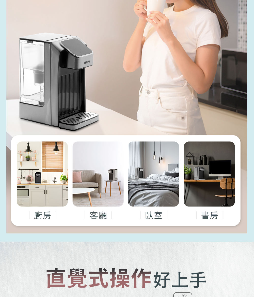 ◆3秒瞬熱即飲,獨特加熱管技術,每一口都新鮮。◆9種溫控x11種水量設置,喝水、沖泡自由搭配。◆輕巧設計移動方便,隨性擺,插電即用。◆冷光LED觸控螢幕,直覺操作好上手。◆專屬泡奶模式,3種溫度x5種水量,半夜泡奶瞬間來。◆92度C+2種水量選擇,沖出咖啡最佳風味。◆精密溫度晶片+精準流量計,提升精確度。◆濾芯經SGS檢驗,有效過濾氯、鉛、鎘等有害物質。◆濾芯輕鬆更換,全家人都能輕易上手。◆智慧除水垢,自動顯示清潔,省時又便利。◆可拆卸水箱,方便裝水、清潔。◆可拆式集水盤,清潔不費力。◆安全上鎖機制,20秒未操作機器即自動鎖定。