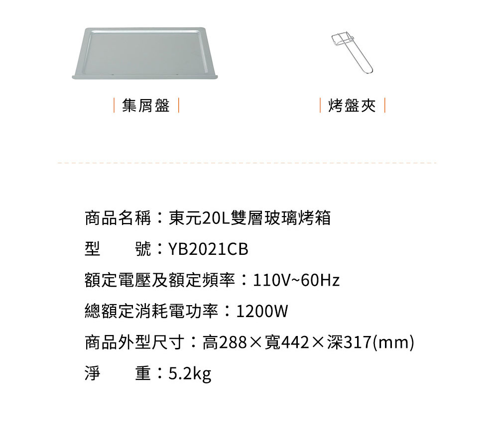 ◆機體尺寸:寬442 x 高288 x 深317 (mm)◆內腔尺寸:寬309 x 高241.2 x 深250 (mm)◆商品淨重:5.2 Kg◆額定電壓:110V◆額定頻率:60Hz◆消耗消耗電功率:1200W◆容量:20L◆烤盤材質:鋼板搪瓷◆烤網材質:鐵絲鍍鉻◆內腔體材質:鍍鋅鋁板◆玻璃材質:鋼化玻璃◆配件:烤盤、烤網、烤盤夾、集屑盤◆國際條碼:4718074434510◆產地:中國◆BSMI商檢字號:R31303(2026.11.05到期)◆效期:無效期◆保固:正常使用下保固1年