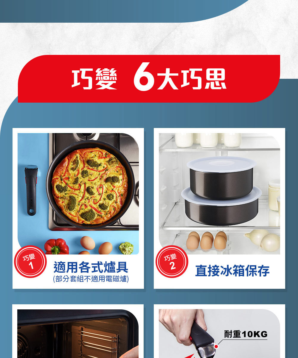 ◆獨特可拆式把手,3點固定減少滑動,耐重更達10kg,超長10年保固。◆把手一拆進烤箱,蓋上保鮮蓋進冰箱,烹煮、放入廚房電器、保存都自由。◆把手一拆,洗鍋就像洗盤不卡卡,搭配不沾塗層超好洗,還能放洗碗機。◆獨家技術佳溫紅心,180°C時紅心會改變顏色,熱鍋完成一看即知。◆TITANIUM 6X終極抗刮鈦金塗層,法國特福獨家研發最高等級的不沾塗層,添加高硬度晶體,極抗磨、超耐刮,超乎預期的烹調效能,盡情料理不受限!◆厚實磁化底部,導熱超快又均勻、儲熱效能佳,IH電磁爐同樣快速加熱。◆導熱底部中央防變形設計,延長使用壽命。◆由鍋內到鍋外不沾處理無縫接合,讓鍋子乾淨無死角,滿足衛生需求。◆法國生產製造原裝進口,塗層經法國國家認可機構檢定,符合法國及歐洲鍋具安全規定,不含PFOA,安全可靠。◆可冷鍋冷油烹調,符合低脂低熱量、少油煙烹調的需求。