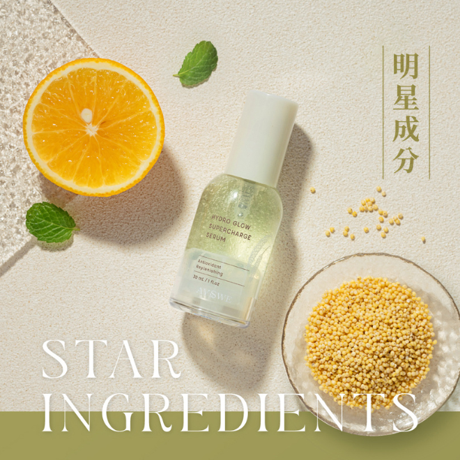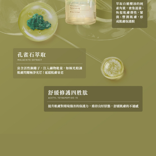 取自台灣花東原生種狐尾粟糠皮,含有一般穀物中缺乏的維生素A、B1、B2、、E 及補水礦物質、豐富的植物固醇增強肌膚屏障功能,修護已受損的肌膚。孔雀石萃取Malachite Extract:富含活性銅離子,注入礦物能量,如極光般讓肌膚閃耀極淨