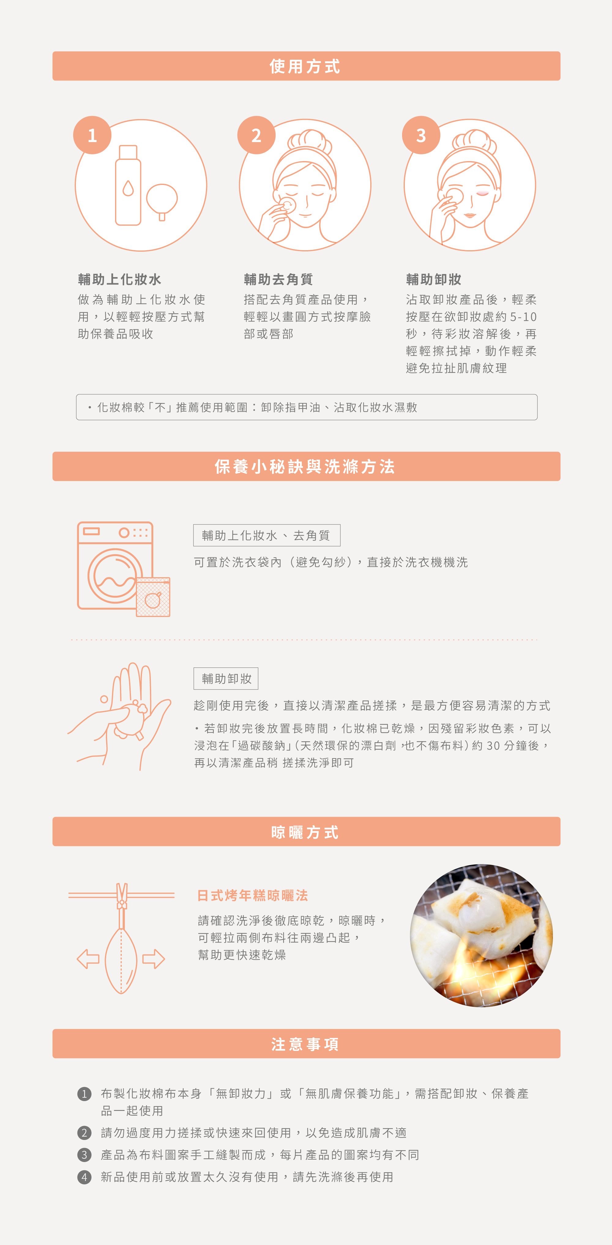 表面花色布:棉布 / 二重紗布 (日、韓、台布料)背面素色布:天鵝絨布(台灣製布料)*無動物來源布料並會附上完整使用、保存、及洗滌說明尺寸:直徑約 7-8 cm*花色隨機出貨產地:台灣保存期限:布化妝棉平均壽命約4-6個月,依據每個人使用頻率、清潔晾曬習慣及保存氣候環境會有所不同。建議判斷方法是當你發現布材吸收力明顯下降、產品開始泛黃、或勾紗嚴重時,就可以汰換囉